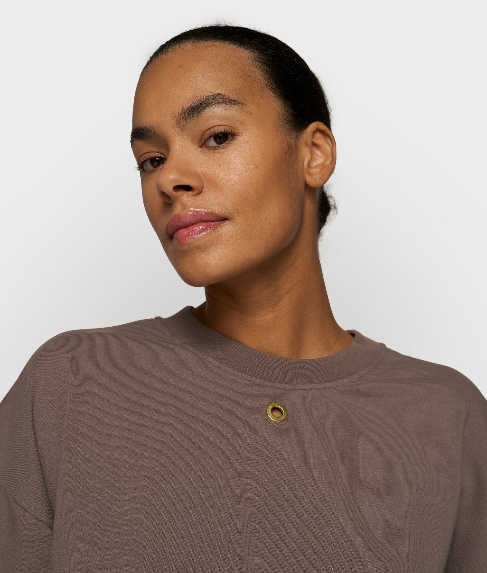 Relaxed Fit Ballon-Sweatshirt aus weicher, GOTS-zertifizierter Bio-Baumwolle. Versehen mit kurzen Ärmeln, einem Rundhalsausschnitt mit Rippbündchen, einer Metallöse am Halsausschnitt sowie einer „10“-Monogrammstickerei auf dem linken Ärmel. Der Saum ist für den Ballon-Effekt mit Falten und einem innenliegenden Gummizug versehen.