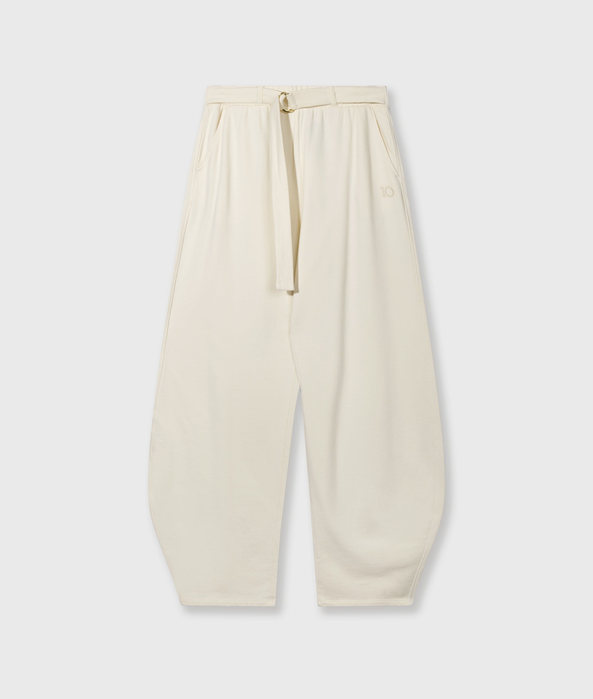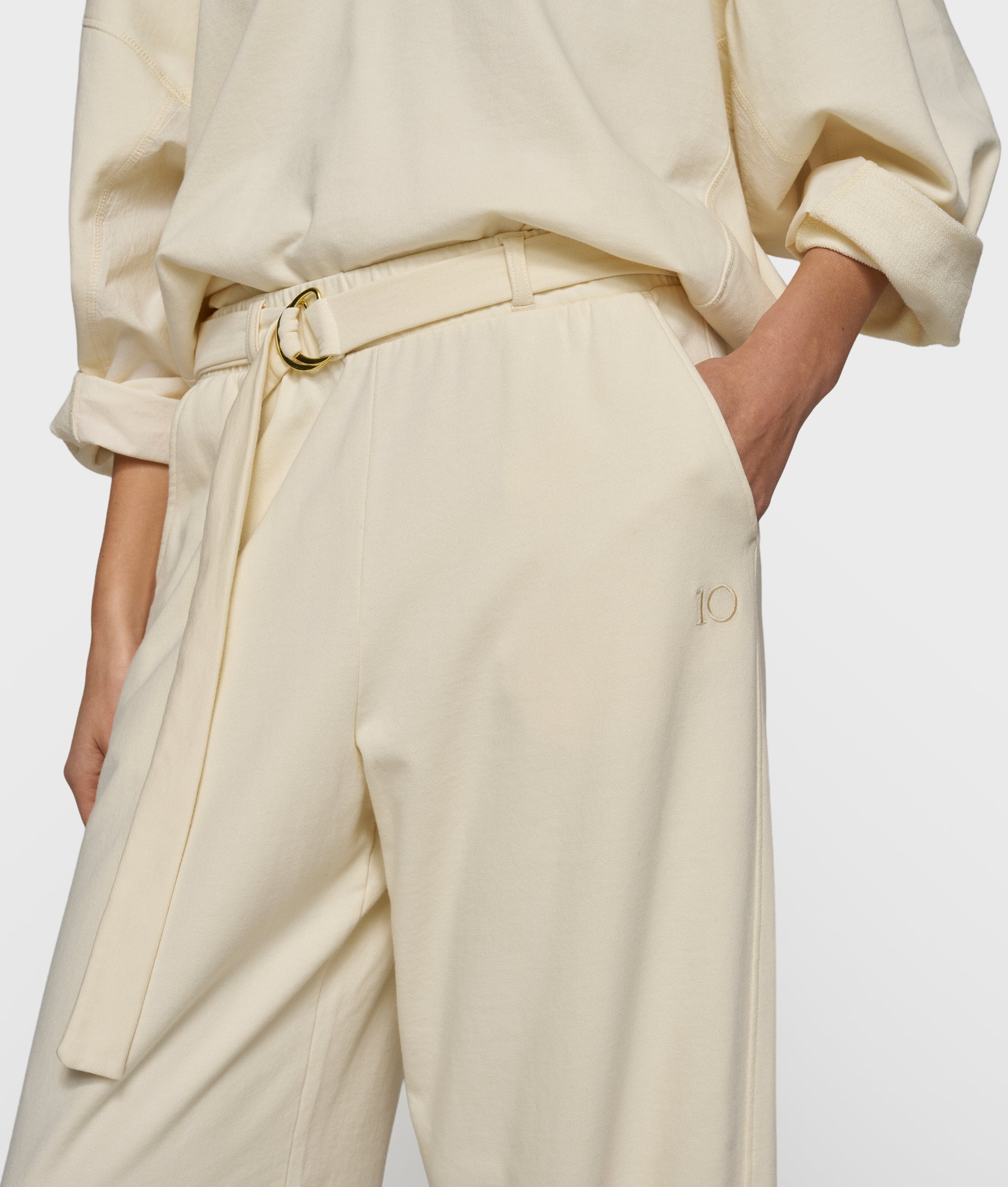 Relaxed Fit Fleecehose, aus weichem, GOTS-zertifiziertem Bio-Baumwollfleece gefertigt. Mit Gummizugbund und Gürtel, Doppel-D-Verschluss, schrägen Eingrifftaschen, Gürtelschlaufen, einer Fake-Gesäßtasche sowie einer „10“-Monogrammstickerei unter der linken Eingrifftasche.