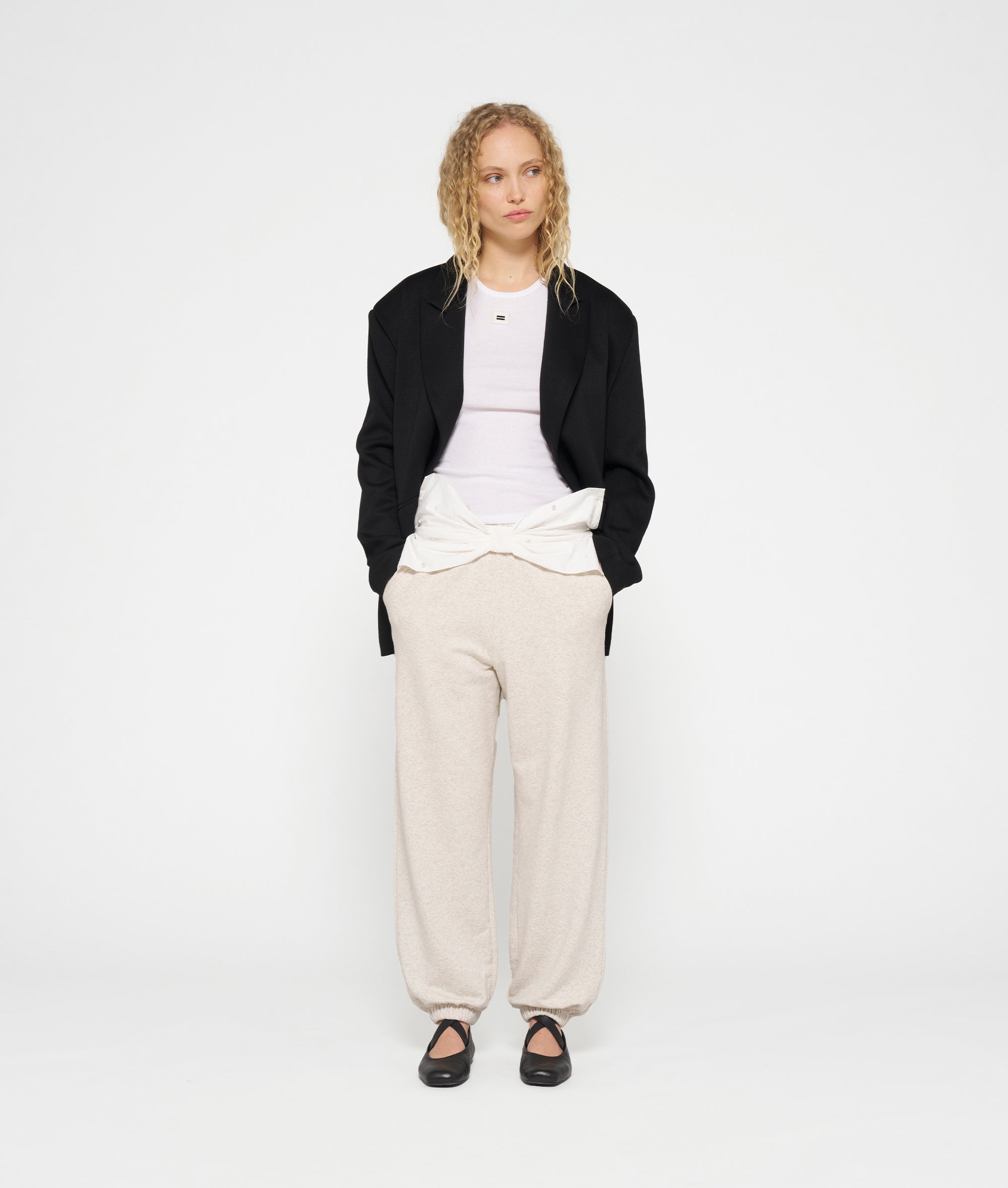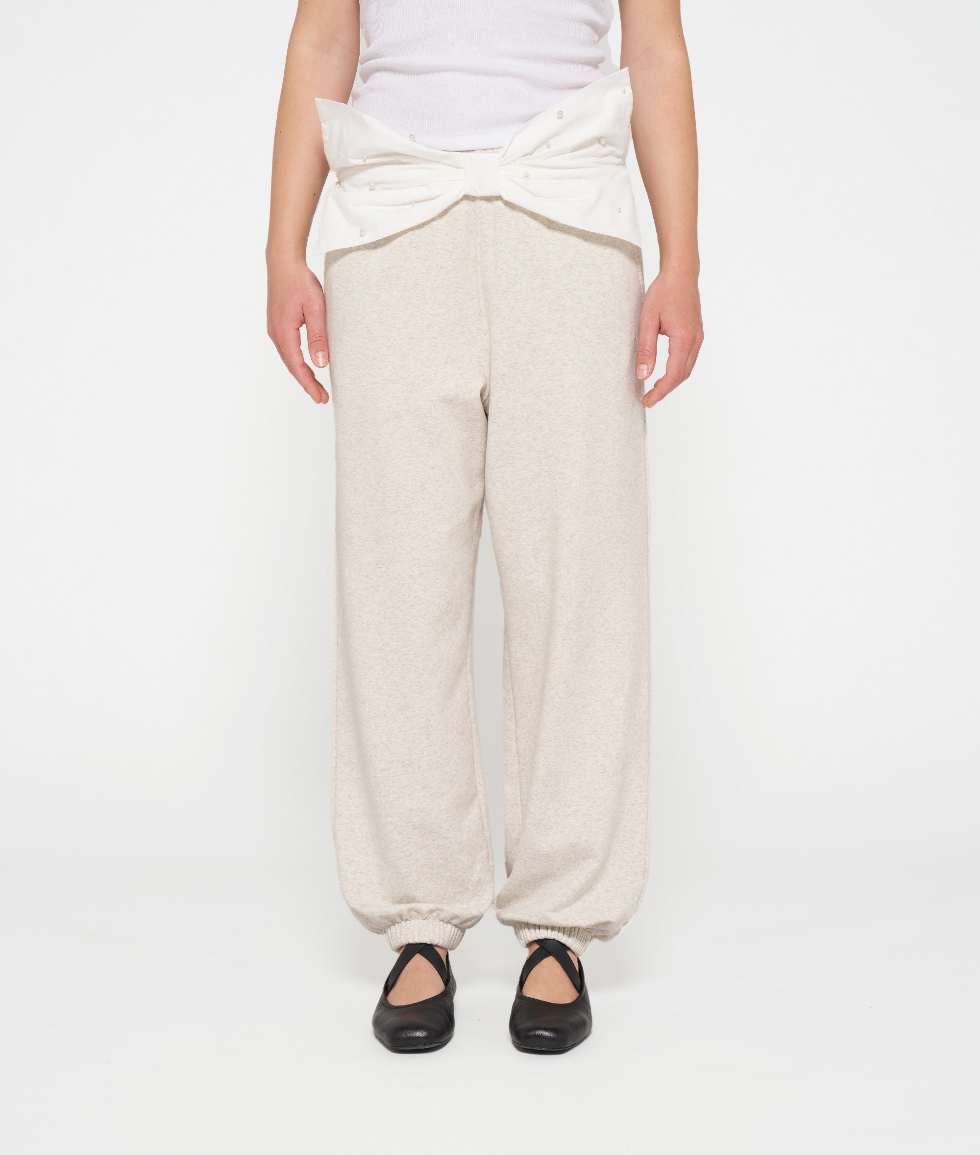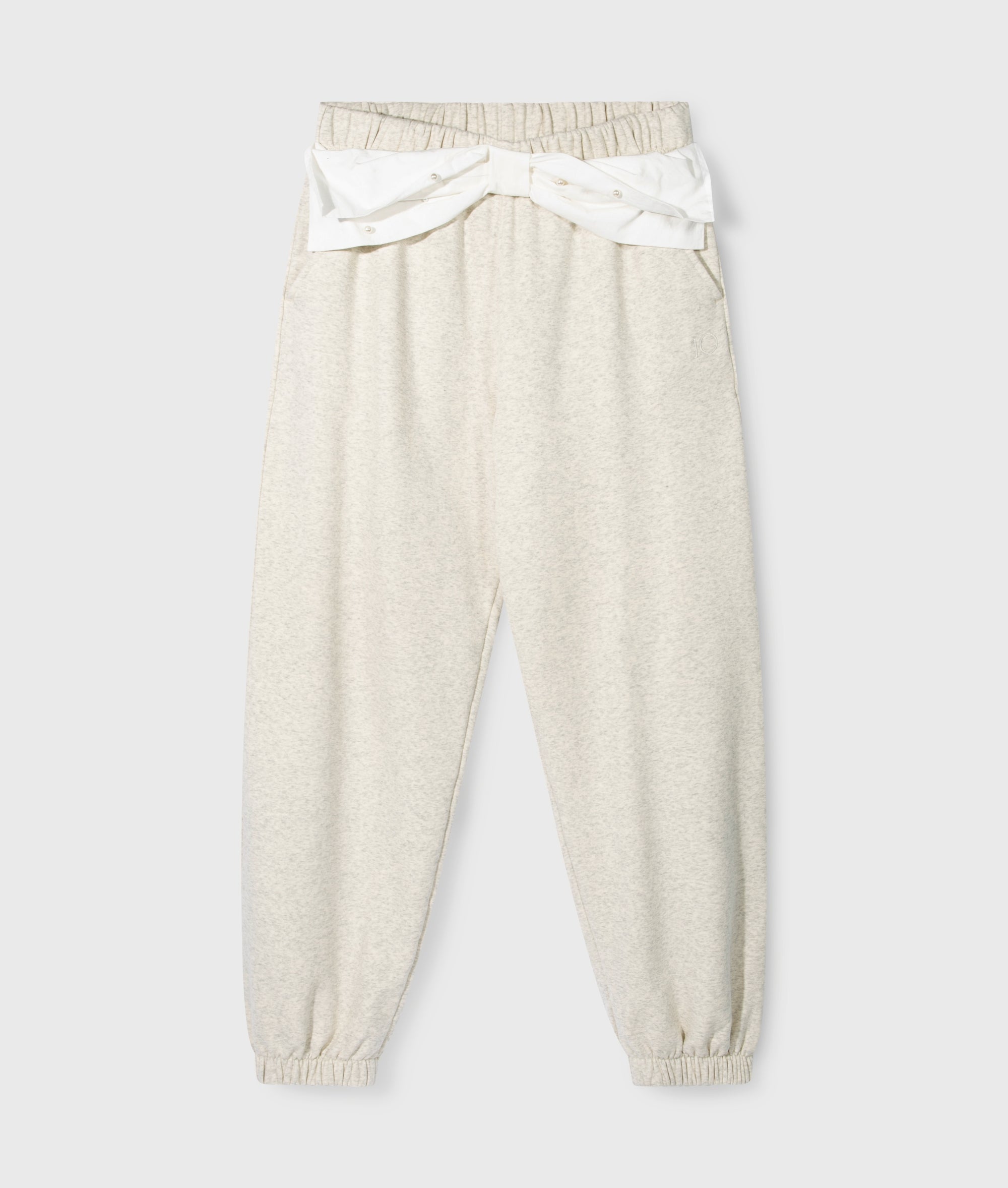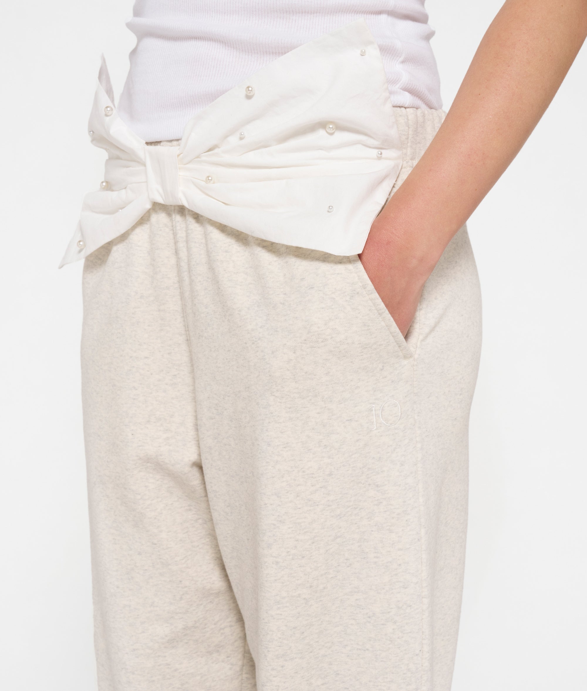 Oversized Fit Bar Jogger, aus weichem Easy Fleece aus Baumwolle gefertigt. Mit einem elastischen Taillenbund mit einer mit Perlen besetzten Schleife aus Baumwollpopeline auf der Vorderseite, schrägen Eingrifftaschen, einer Gesäßtasche, elastischen Bündchen an den Beinabschlüssen und einem unterhalb der linken Eingrifftasche aufgestickten „10“-Monogramm.