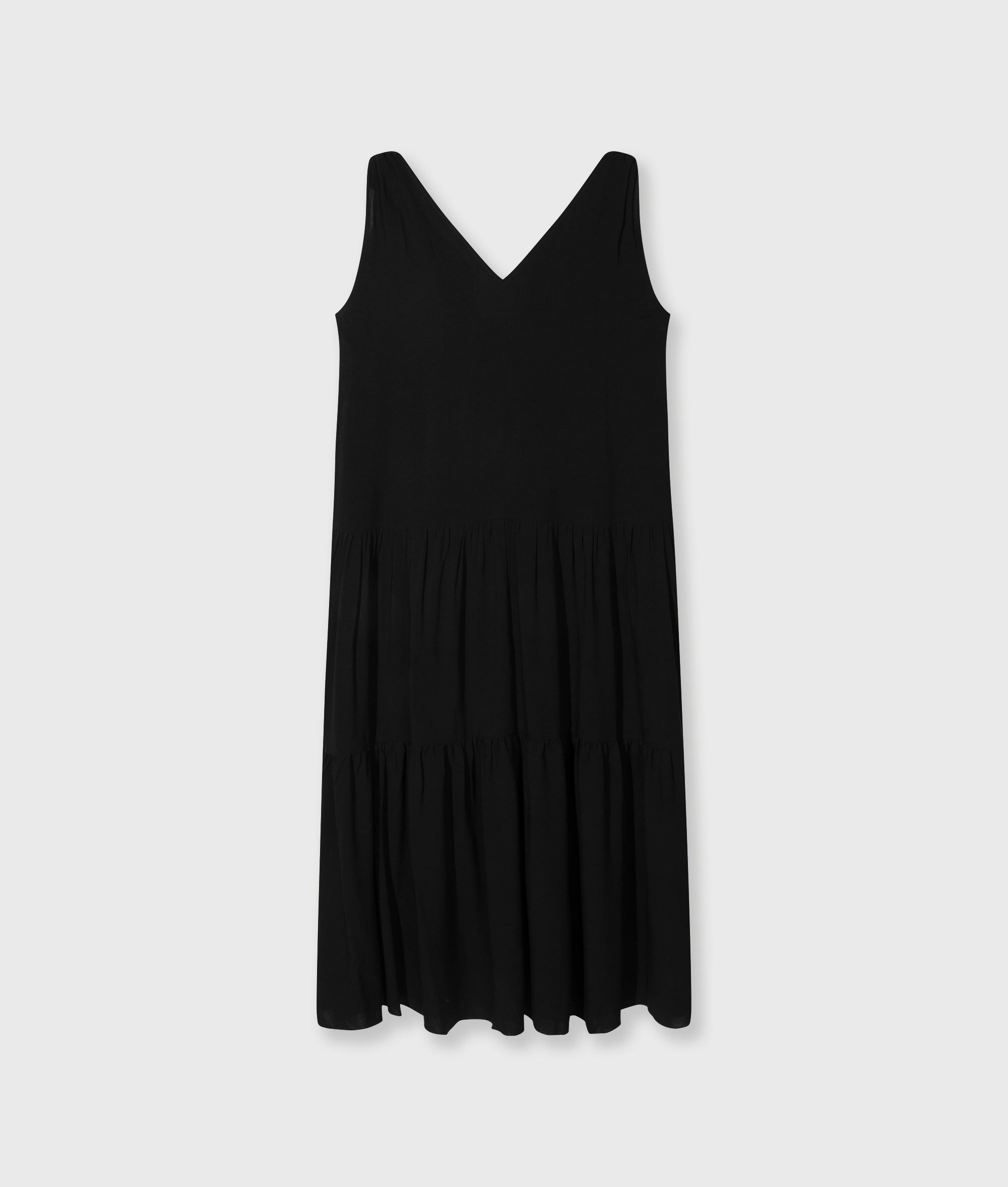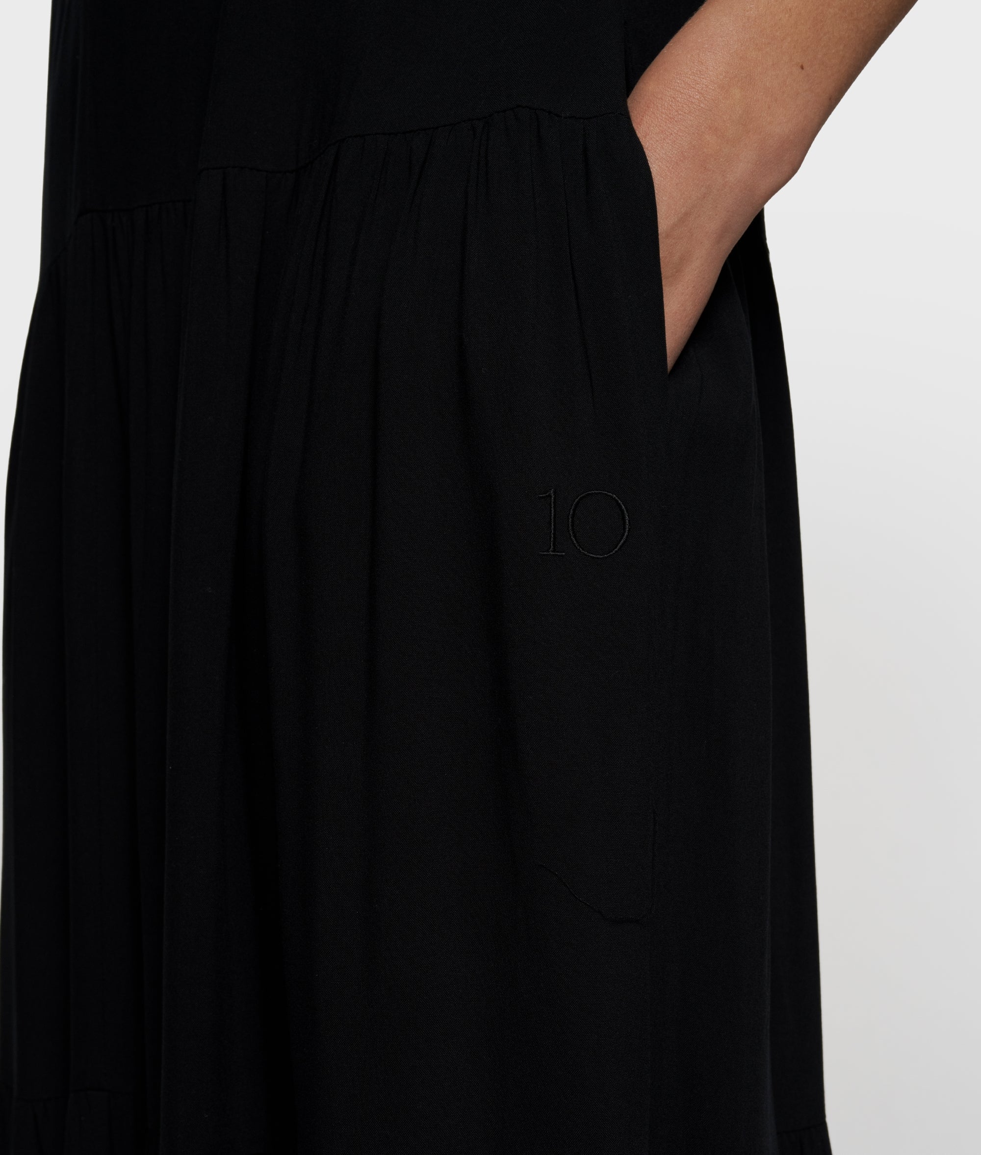 Regular Fit Maxikleid, gefertigt aus geschmeidigem, gewaschenem Lyocell-Twill. Versehen mit einer ärmellosen Silhouette und V-Ausschnitt, einem locker fallenden Lagenrock, Eingrifftaschen, einem Schulterdetail mit Gummizug sowie einer „10“-Monogrammstickerei unter der linken Eingrifftasche.