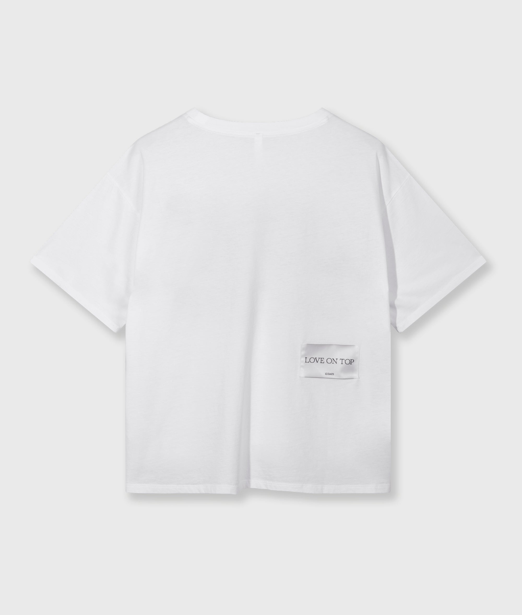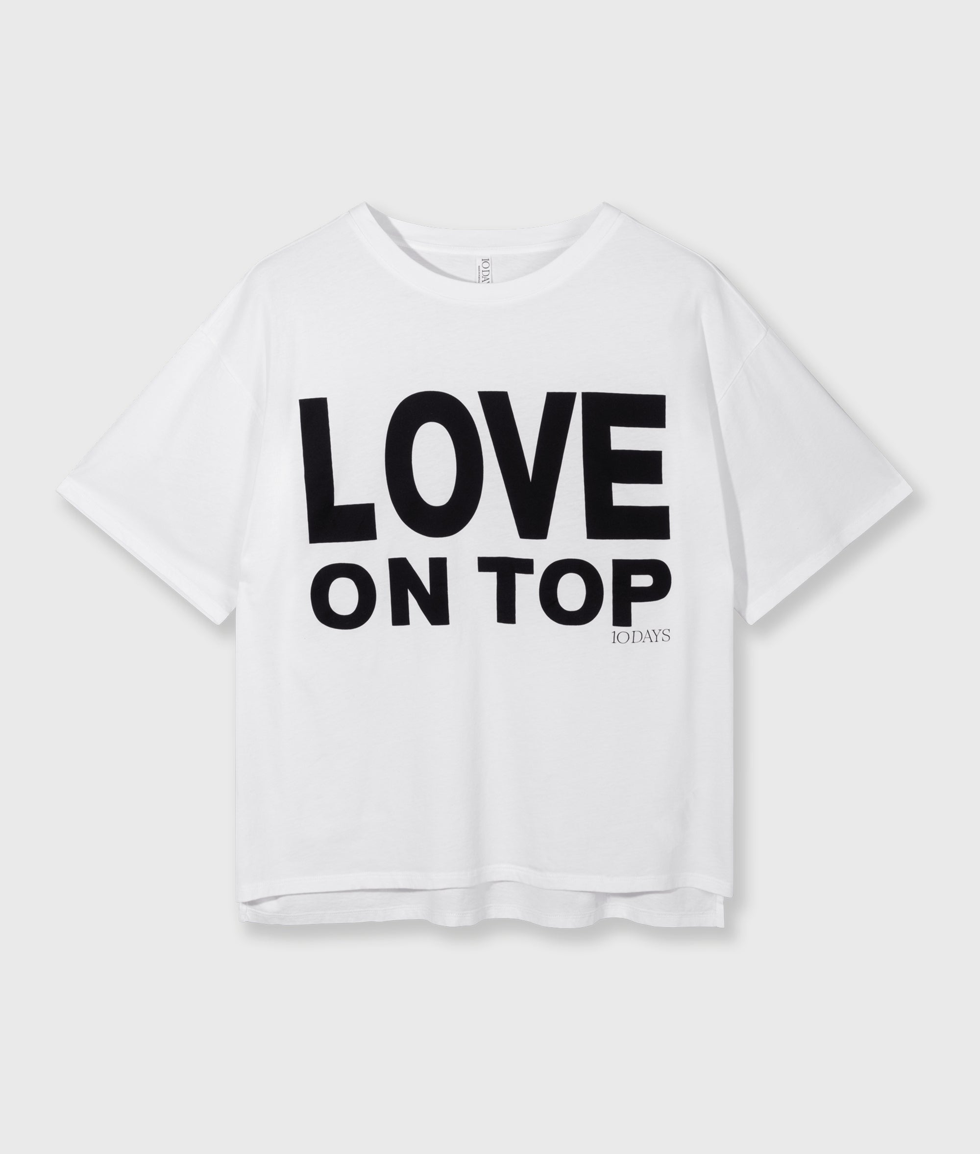 Oversized Fit T-Shirt, gefertigt aus GOTS-zertifizierter Bio-Baumwolle. Versehen mit einem Rundhalsausschnitt mit Rippbündchen, einem „Love on Top bold“-Wasserprint auf der Vorderseite sowie einem Label links unten auf dem Rücken.
