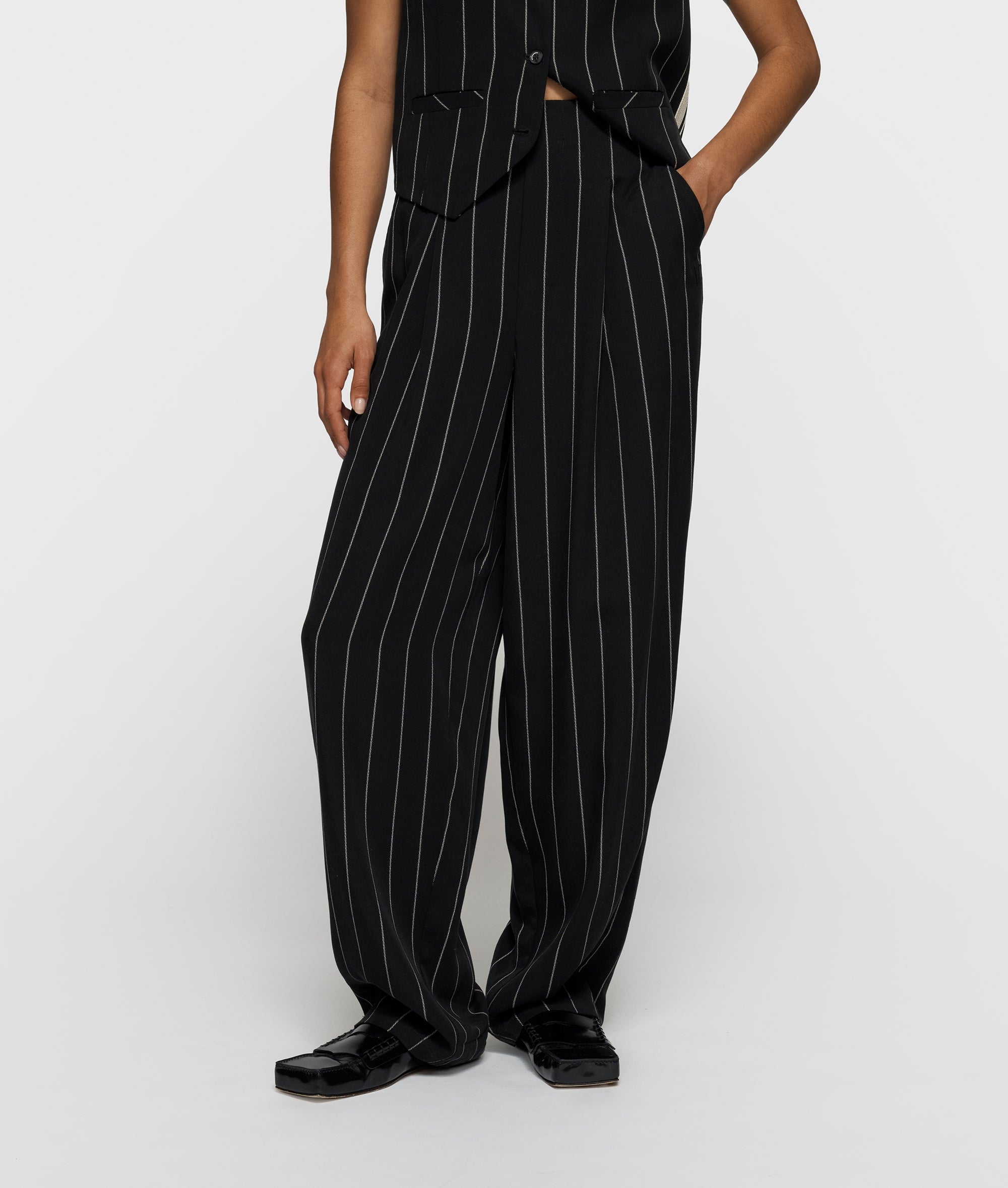 Oversized Fit Nadelstreifenhose mit hoher Taille aus Twill mit attraktiver Waschung. Mit einem elastischen Taillenbund mit Gürtelschlaufen, Eingrifftaschen, einer aufgesetzten Gesäßtasche, Falten an der Vorderseite und einem unterhalb der linken Eingrifftasche aufgestickten „10“-Monogramm. Achtung: auf links bügeln.