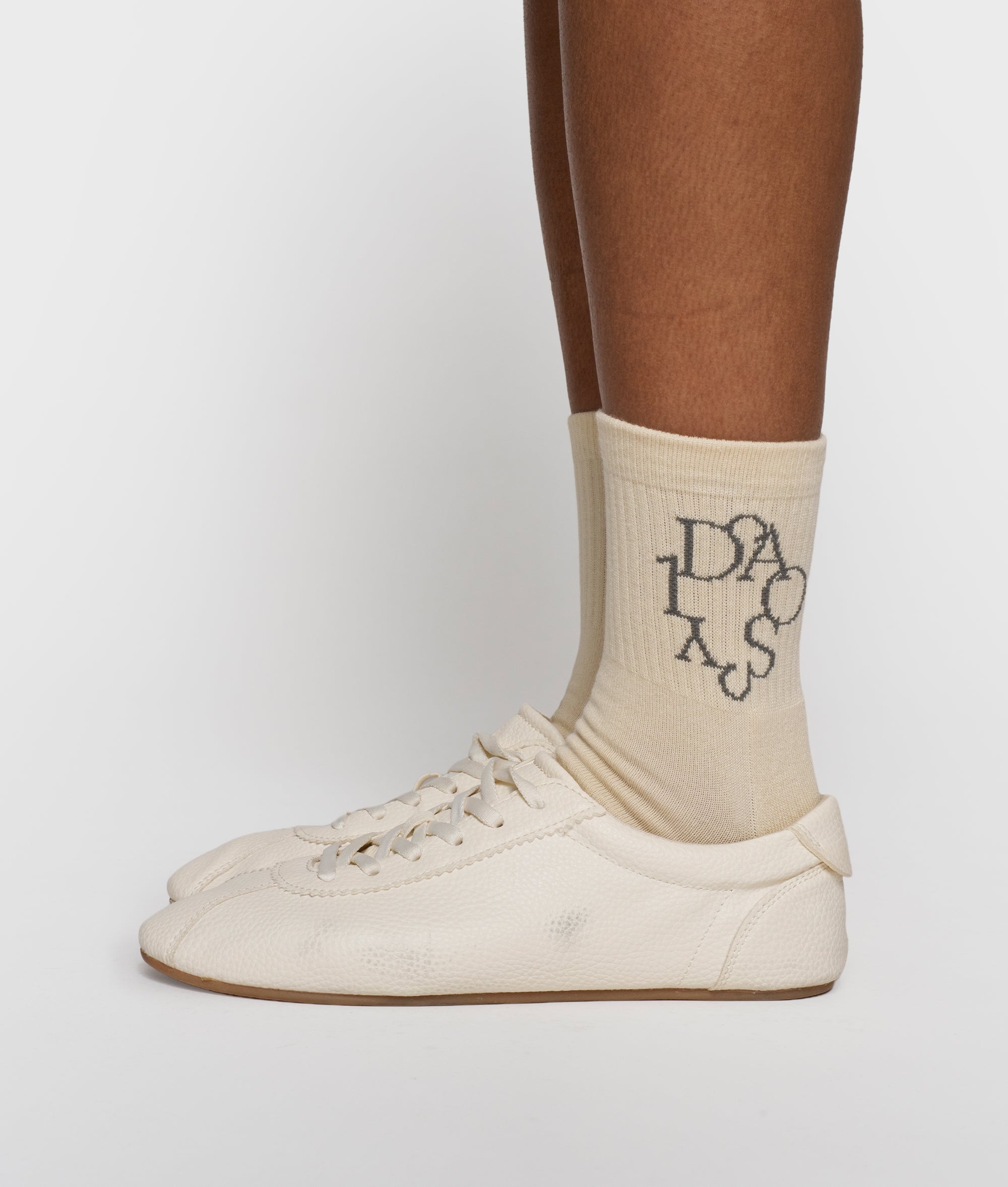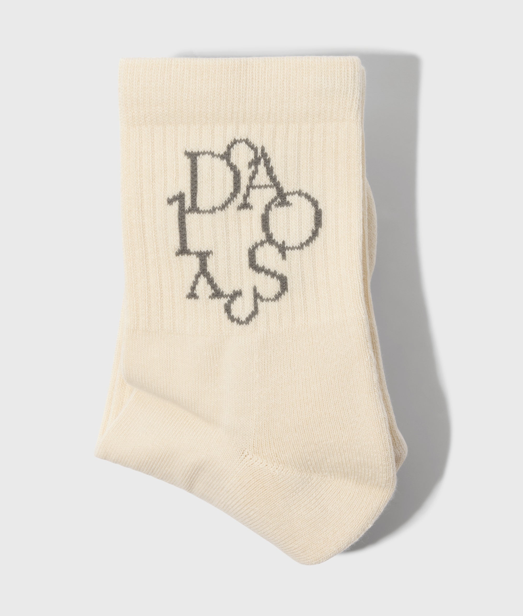 Rippstricksocken mit einer eingewebten „Curly 10“ am Knöchel und einem Logo unter dem Fuß. Versehen mit einem Rippbündchen sowie glänzenden Lurexdetails in Weißgold.