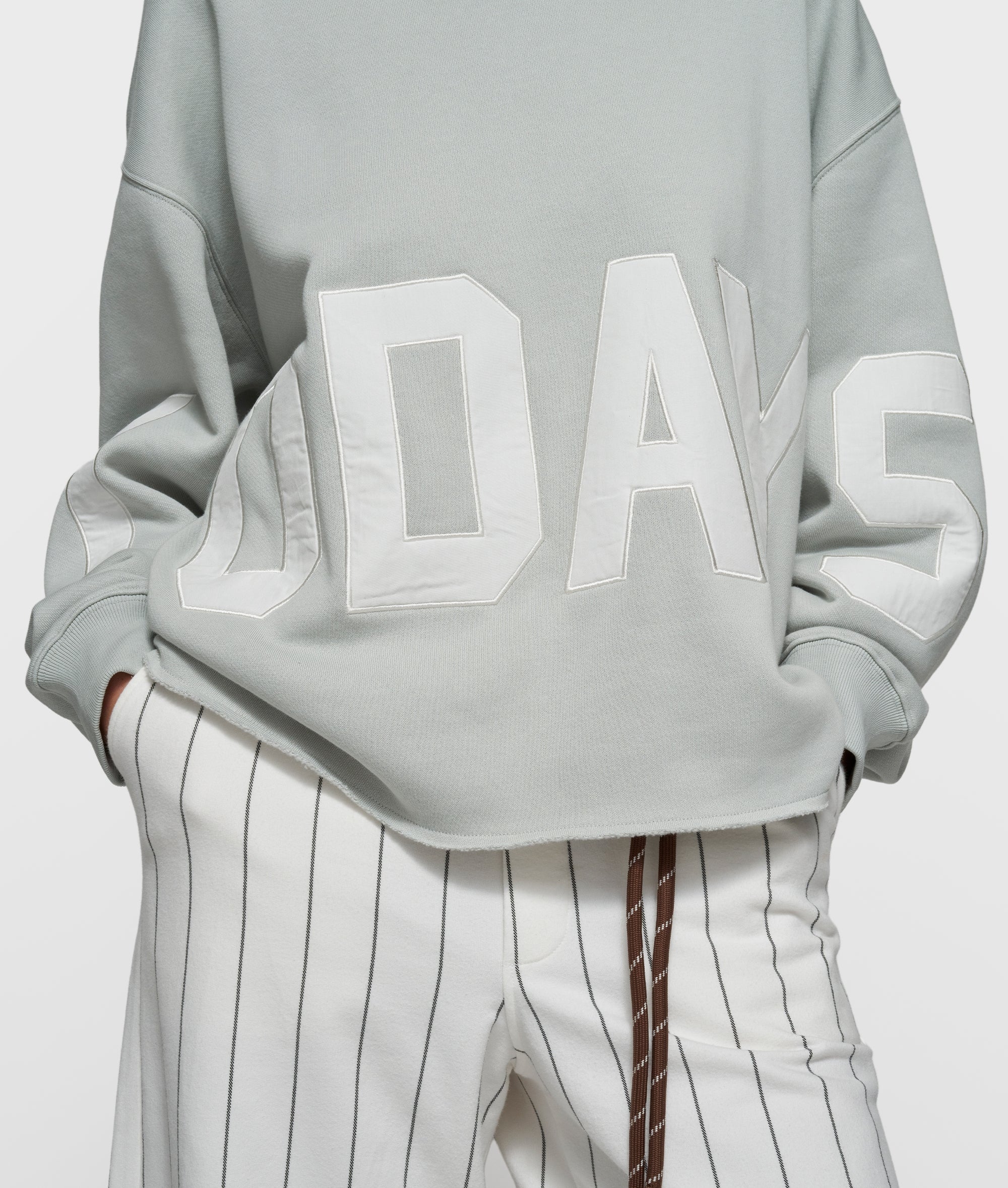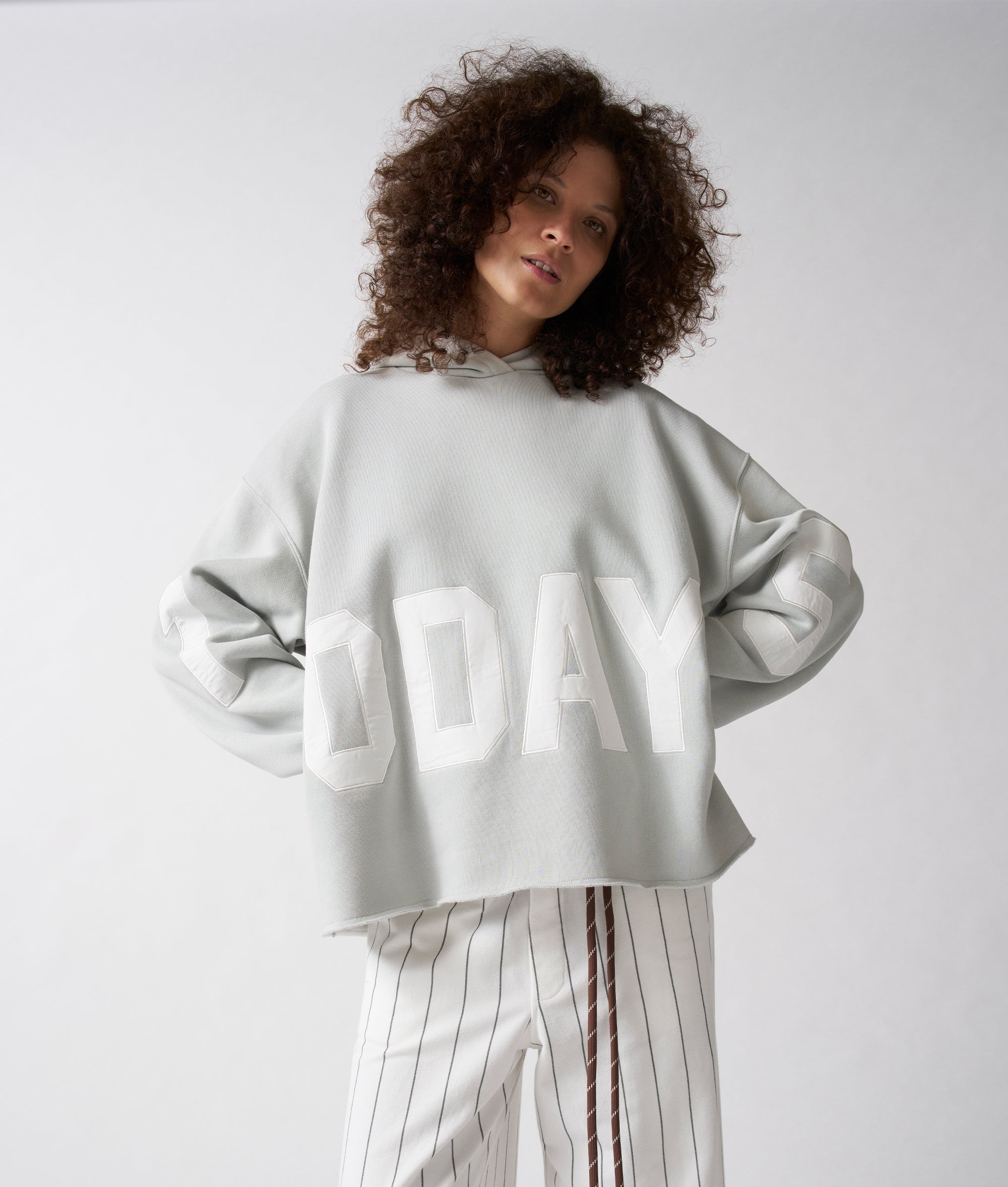 Oversized Fit Statement-Hoodie aus dickem, gebürstetem Fleece. Das Sweatshirt ist an Ärmeln und Rumpf auf der Vorderseite mit einem großen 10DAYS-Logoaufnäher, einer Kapuze, Rippenstrickbündchen und einem Raw-Edge-Saum ausgeführt.