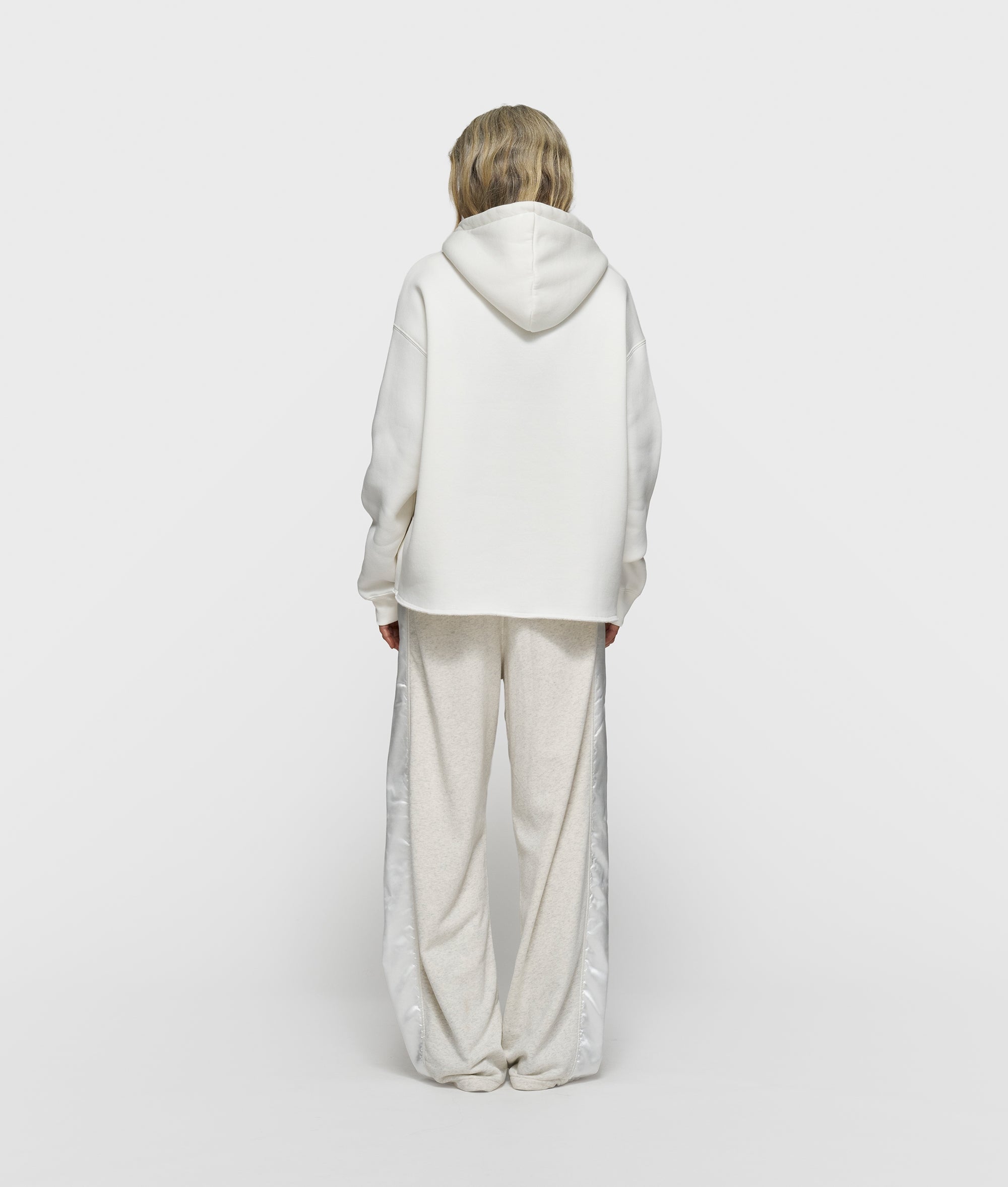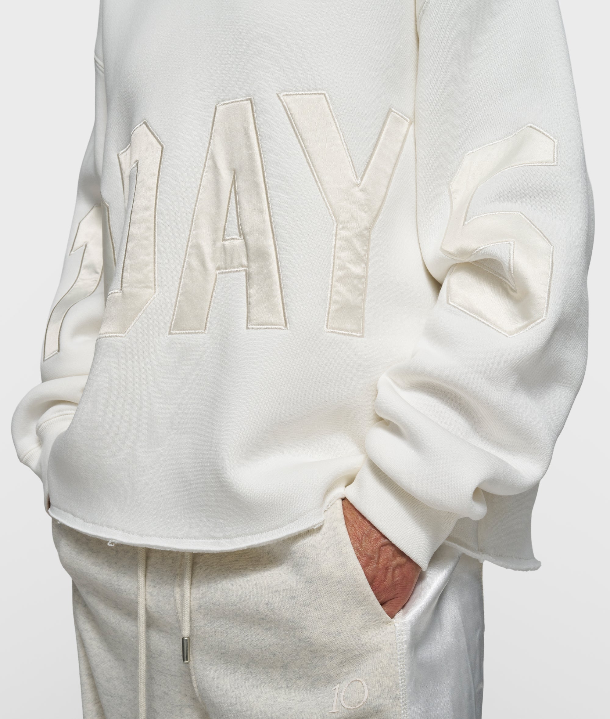 Oversized Fit Statement-Hoodie aus dickem, gebürstetem Fleece. Das Sweatshirt ist an den Ärmeln und am Rumpf auf der Vorderseite mit einem großen 10DAYS-Logoaufnäher, einer Kapuze, Rippstrickbündchen und einem Raw-Edge-Saum ausgeführt.