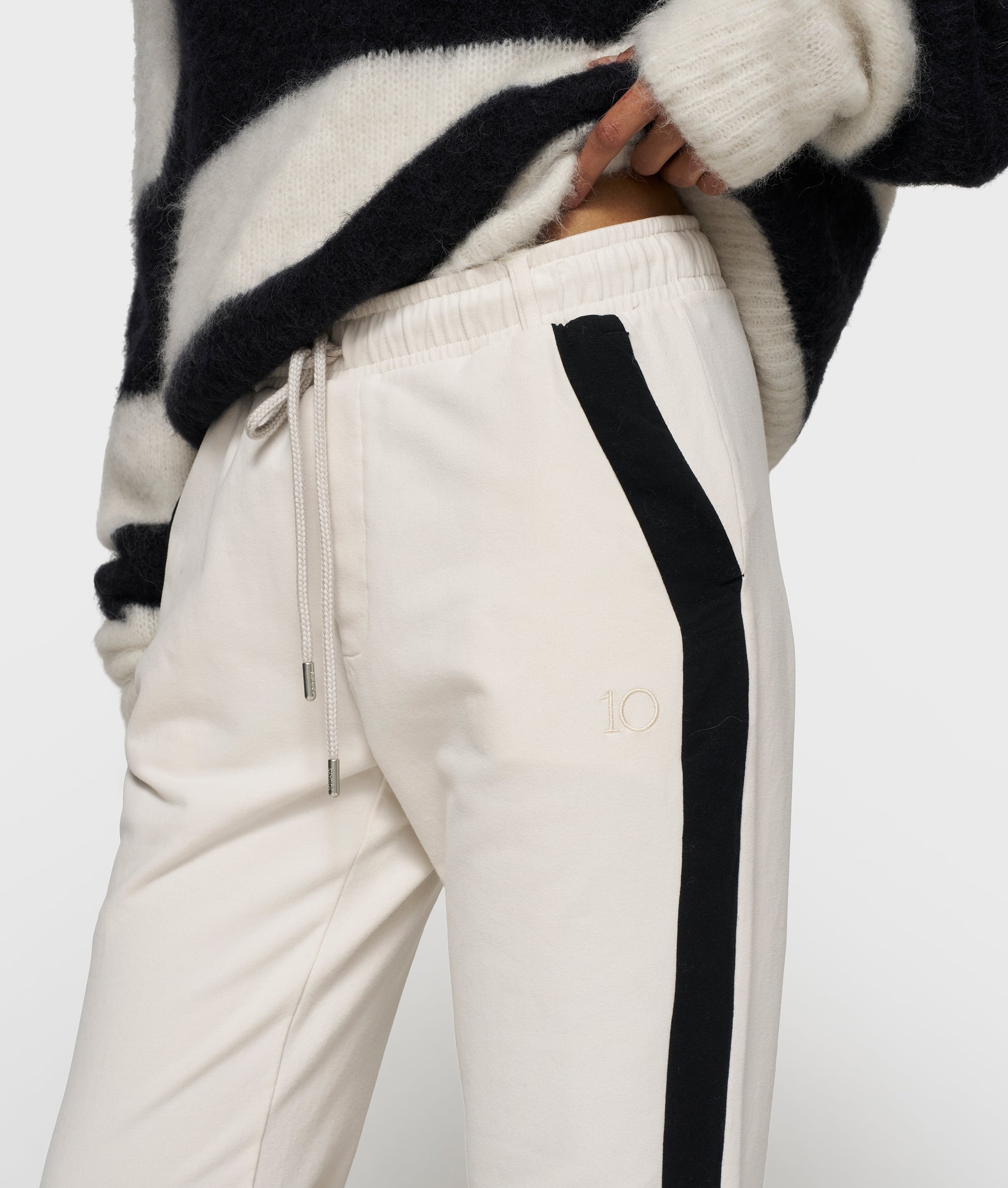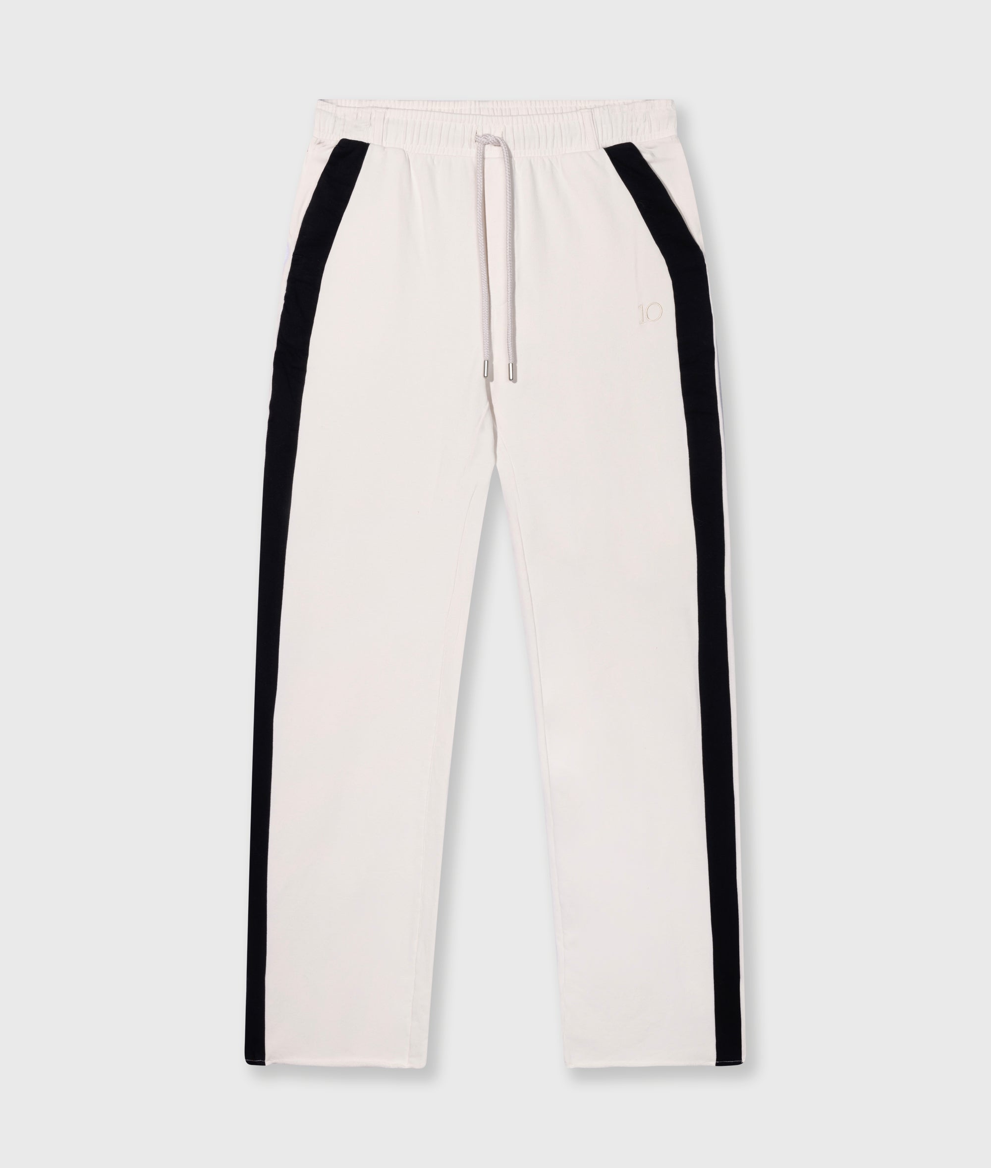 Regular Fit Jogger mit geradem Bein, aus GOTS-zertifizierter Bio-Baumwolle. Ausgestattet mit einem elastischen Taillenbund und Kordelzug, schrägen Eingrifftaschen, einer Fake-Gesäßtasche, Hosenbeinen im Raw-Edge-Stil, Paspelbänder entlang der Seitennähte und einer „10“-Monogramm-Stickerei unter der linken Vordertasche.