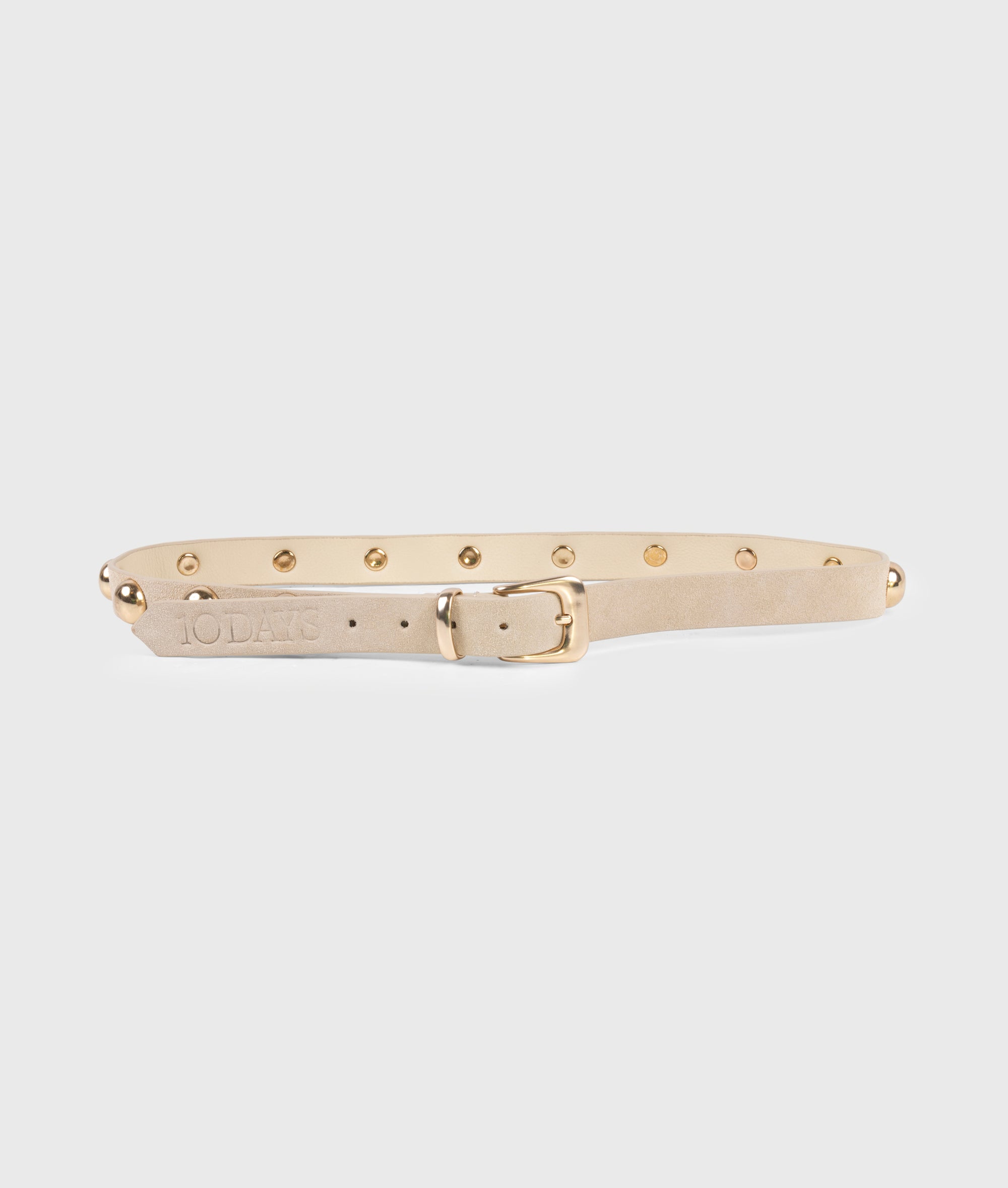 Gürtel aus Veloursleder mit Nieten. Versehen mit einer Metallschnalle sowie einer „10DAYS“-Tiefprägung.