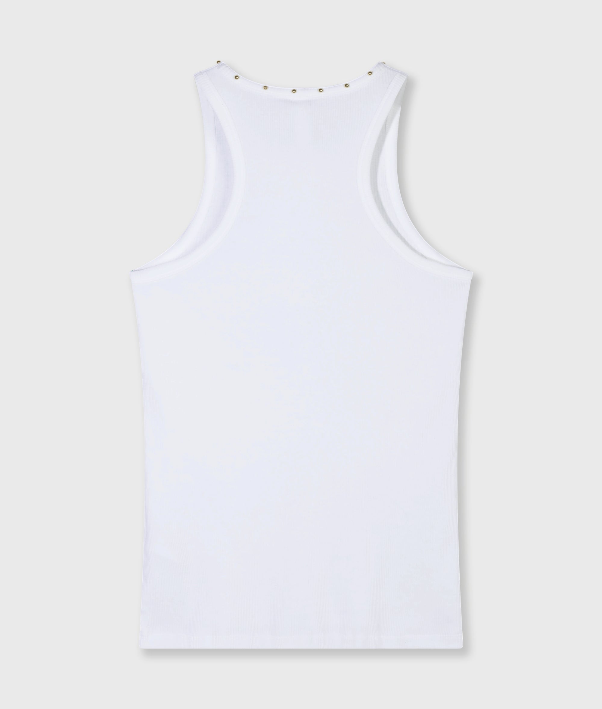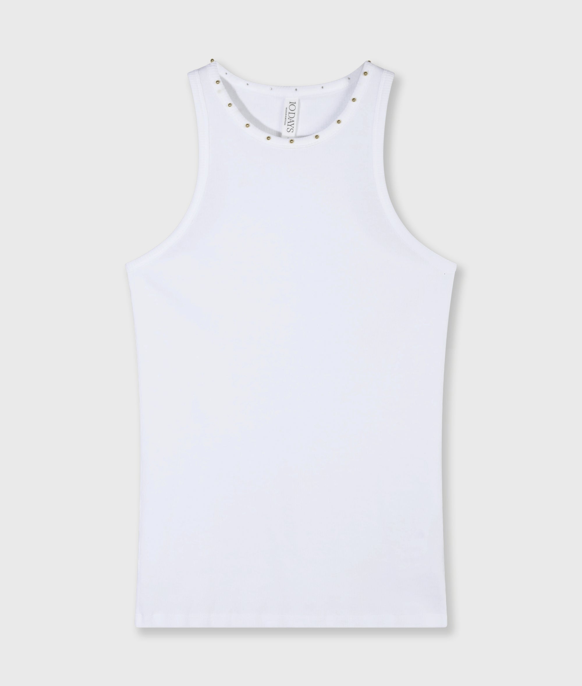 Slim Fit Tanktop mit Perlen, gefertigt aus weichem Baumwoll-Rippjersey. Versehen mit Rippbündchen an Halsausschnitt und Armausschnitten, einem kleinen Label in der Seitennaht sowie kleinen Perlen entlang des Halsausschnitts.