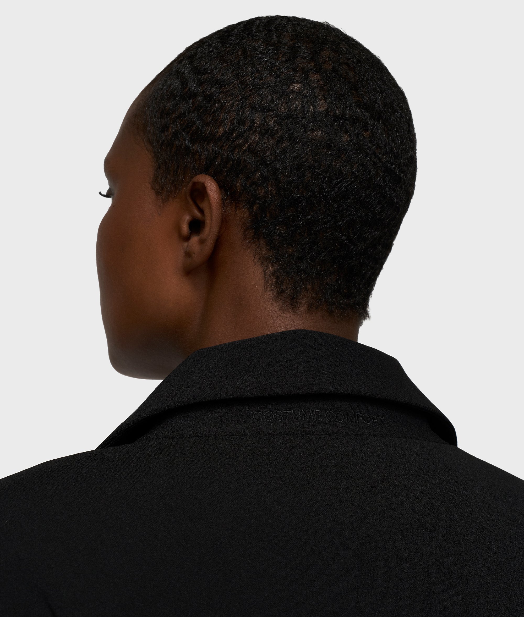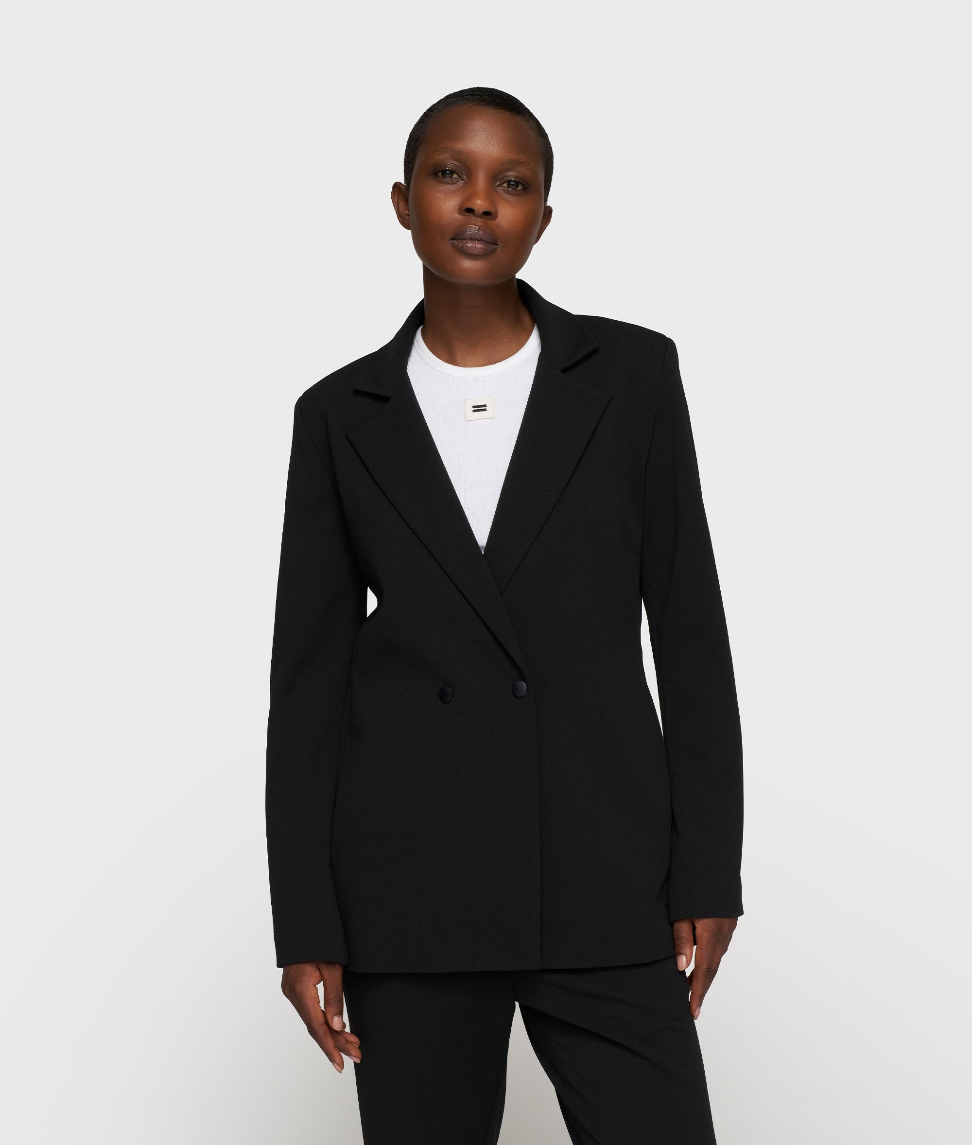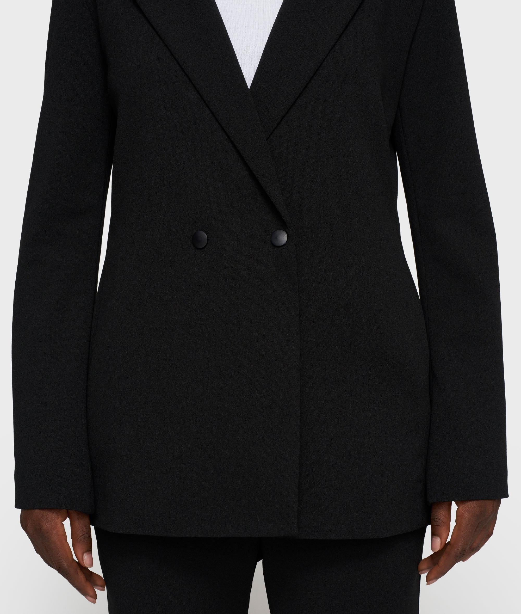 Dieser doppelreihige Blazer im Regular Fit ist aus einer leichten schwarzen Crêpe-Stretch-Qualität gefertigt, die den ganzen Tag über einen hohen Tragekomfort bietet. Der klassische Reverskragen und die dezente Schulterpolsterung verleihen ihm eine kraftvolle, gespflegte Form. Matte Druckknöpfe, Eingrifftaschen, die Stickerei „costume comfort“ am Kragen und ein Schlitz am Rücken sorgen für Funktionalität und Bewegungsfreiheit und machen dieses Modell zu einem zeitlosen Arbeitsstück.