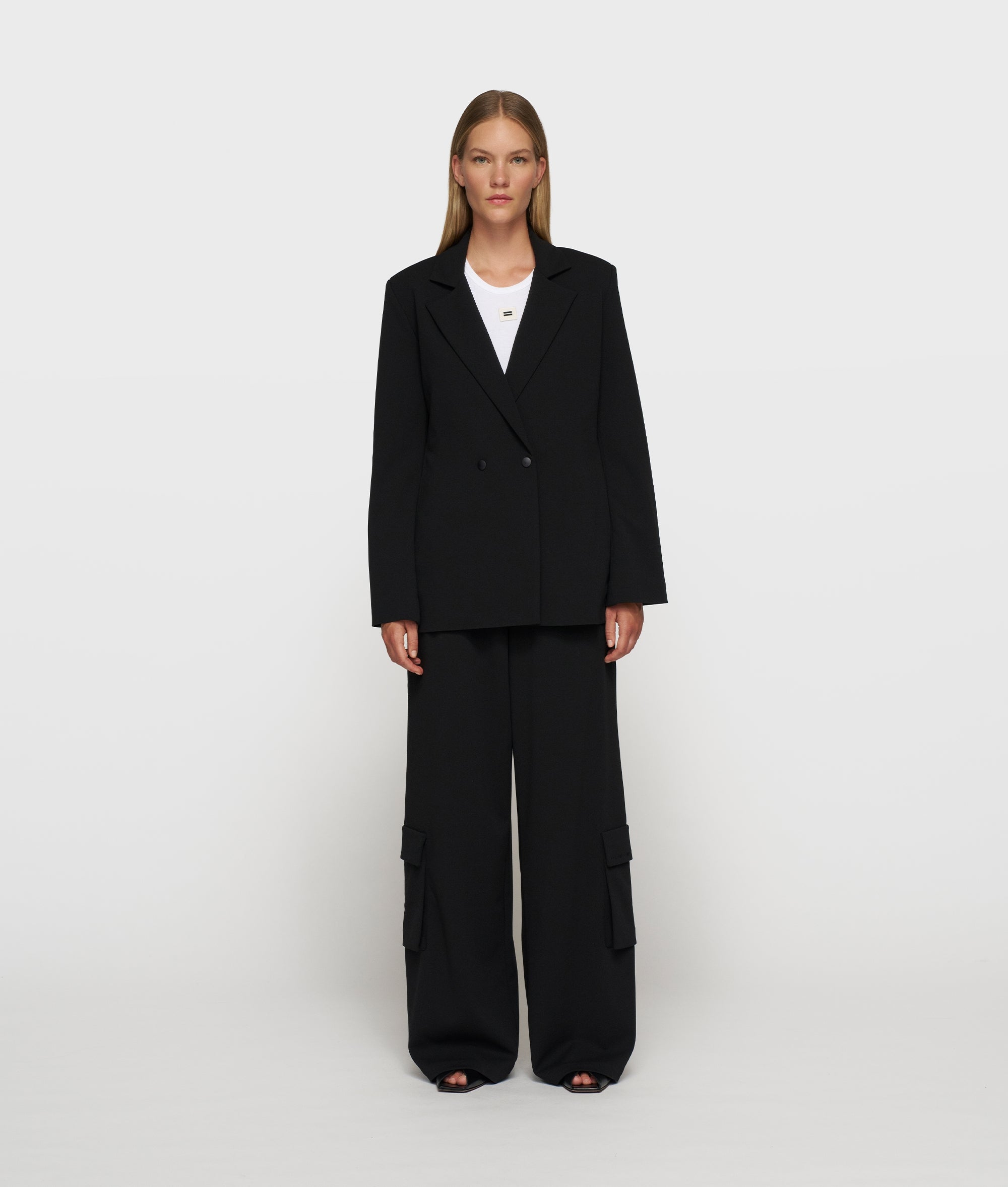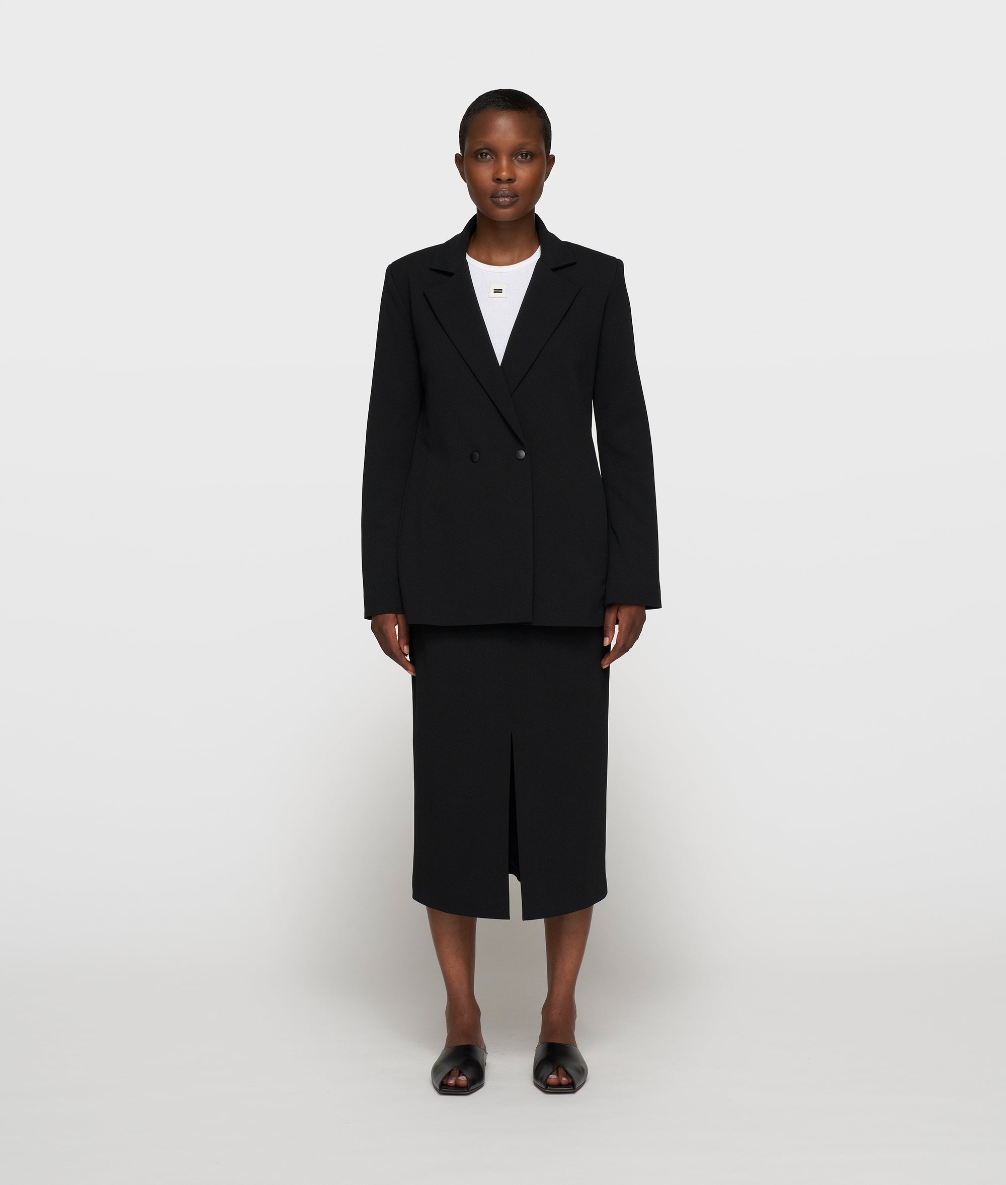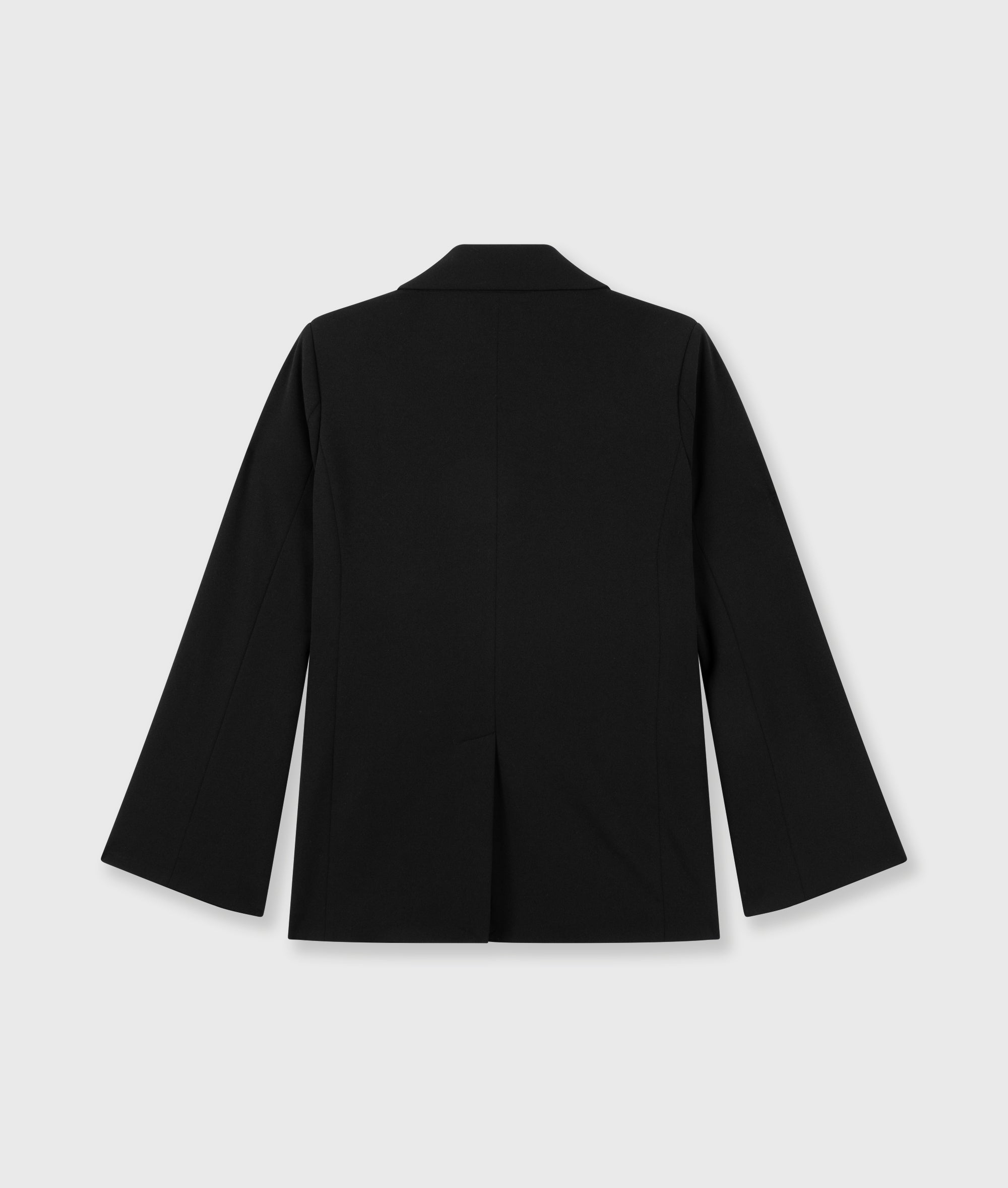 Dieser doppelreihige Blazer im Regular Fit ist aus einer leichten schwarzen Crêpe-Stretch-Qualität gefertigt, die den ganzen Tag über einen hohen Tragekomfort bietet. Der klassische Reverskragen und die dezente Schulterpolsterung verleihen ihm eine kraftvolle, gespflegte Form. Matte Druckknöpfe, Eingrifftaschen, die Stickerei „costume comfort“ am Kragen und ein Schlitz am Rücken sorgen für Funktionalität und Bewegungsfreiheit und machen dieses Modell zu einem zeitlosen Arbeitsstück.