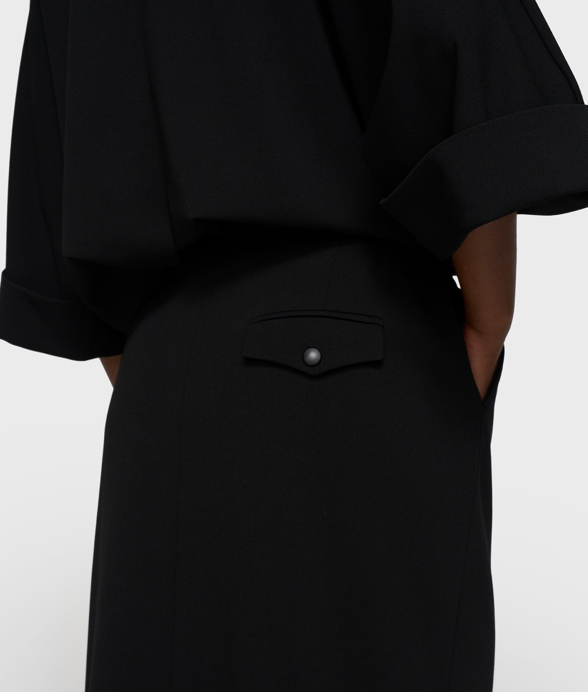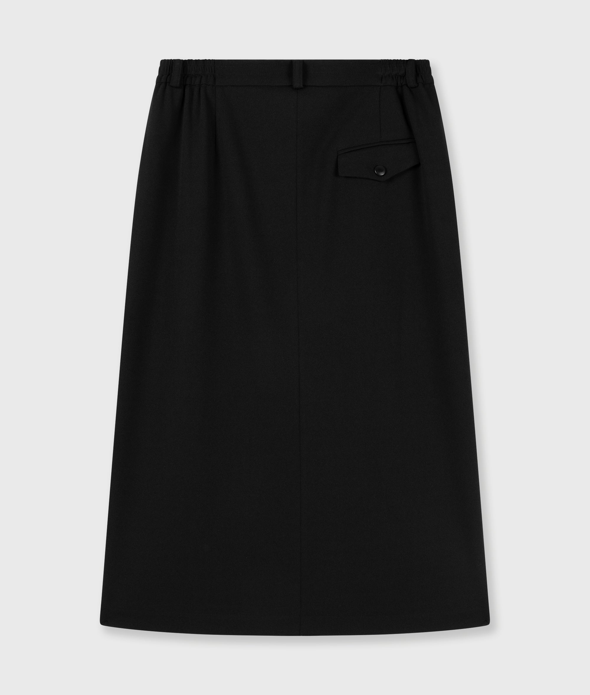 Dieser Midirock im Regular Fit ist aus leichter schwarzer Crêpe-Stretch-Qualität gefertigt, die sich geschmeidig mitbewegt und angenehm trägt. Die mittelhohe Taille mit elastischem Bund sowie Hosenschlitz mit Reißverschluss und Knopf sorgen für einen professionellen Look. Seitliche Eingrifftaschen, ein Schlitz auf der Vorderseite, eine dezent angedeutete Gesäßtasche und die kennzeichnende Stickerei „costume comfort“ unter der linken Eingrifftasche sorgen für eine klare Silhouette. Das Design macht diesen Artikel ideal für Arbeit und Reisen mit einem mühelosen Look.