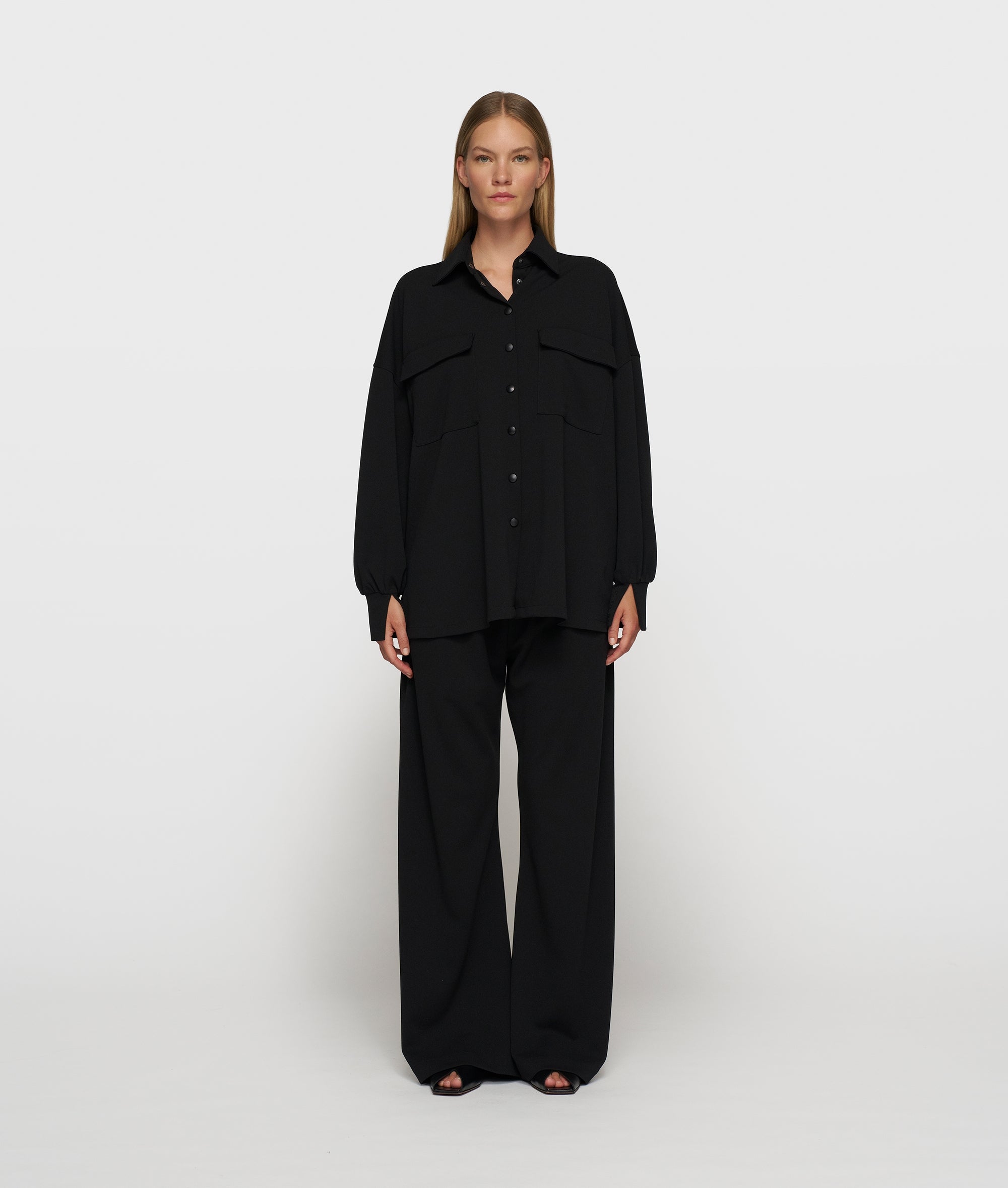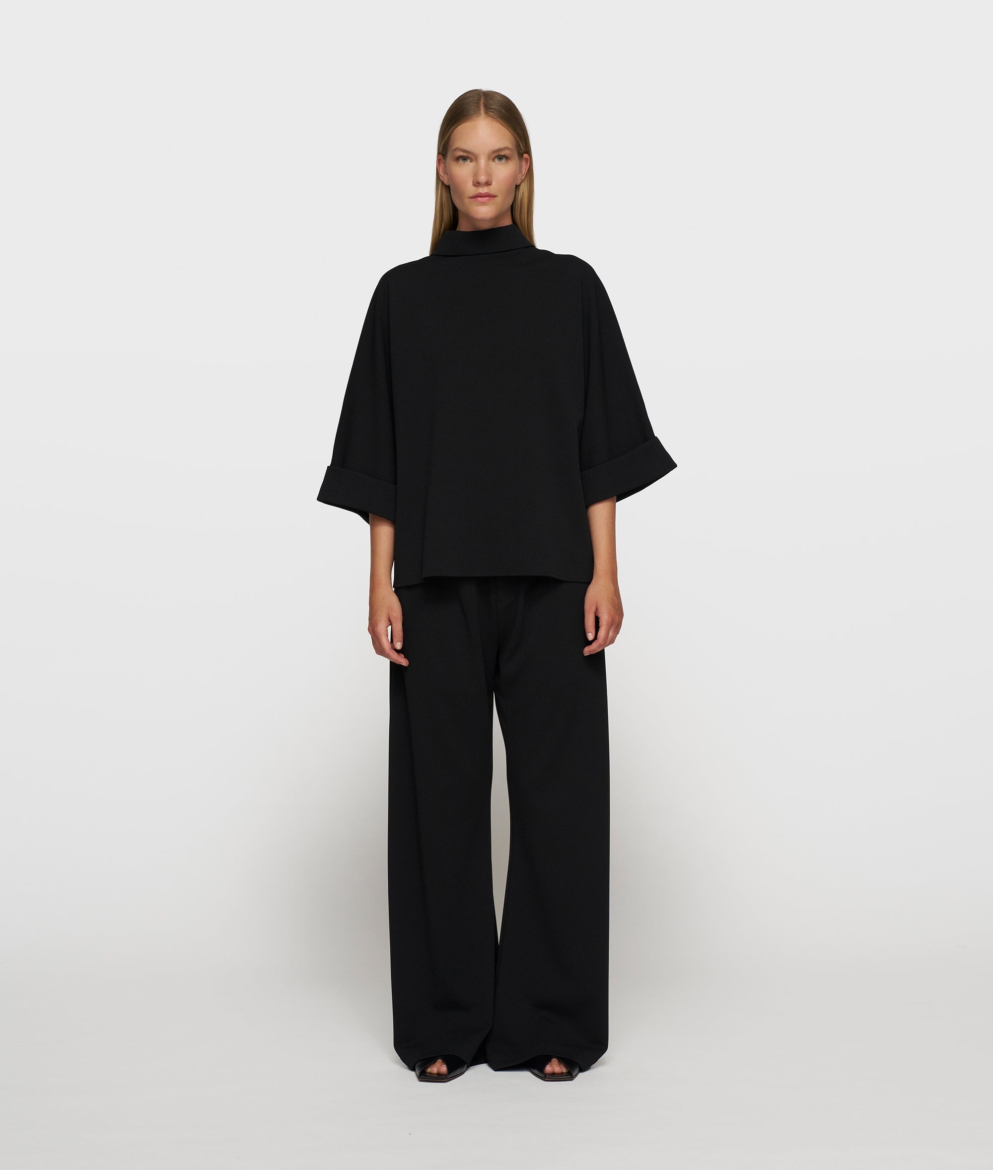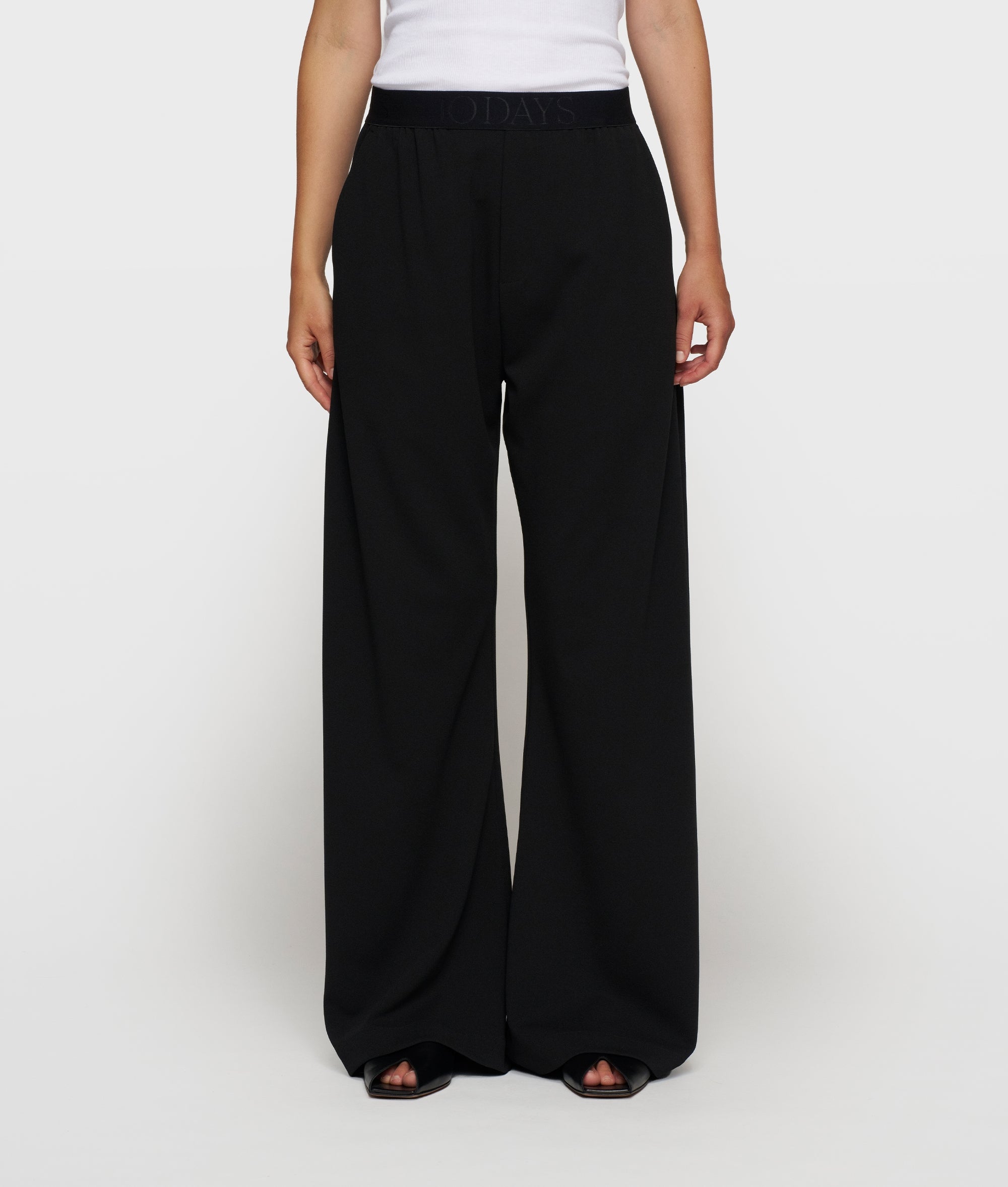 Diese Hose im Relaxed Fit und weitem Bein ist aus leichter schwarzer Crêpe-Stretch-Qualität gefertigt, die sich geschmeidig mitbewegt und bequem anfühlt. Die mittelhohe Taille und der elastische Bund mit dem dezenten „10DAYS“-Logo sorgen für einen mühelosen Sitz. Durch das weite Bein und die Eingriffstaschen wird ein moderner, entspannter Look kreiert, während der angedeutete Hosenschlitz für eine klare Silhouette sorgt. Ideal für Arbeitstage, Reisen und eine mühelose, professionelle Optik.