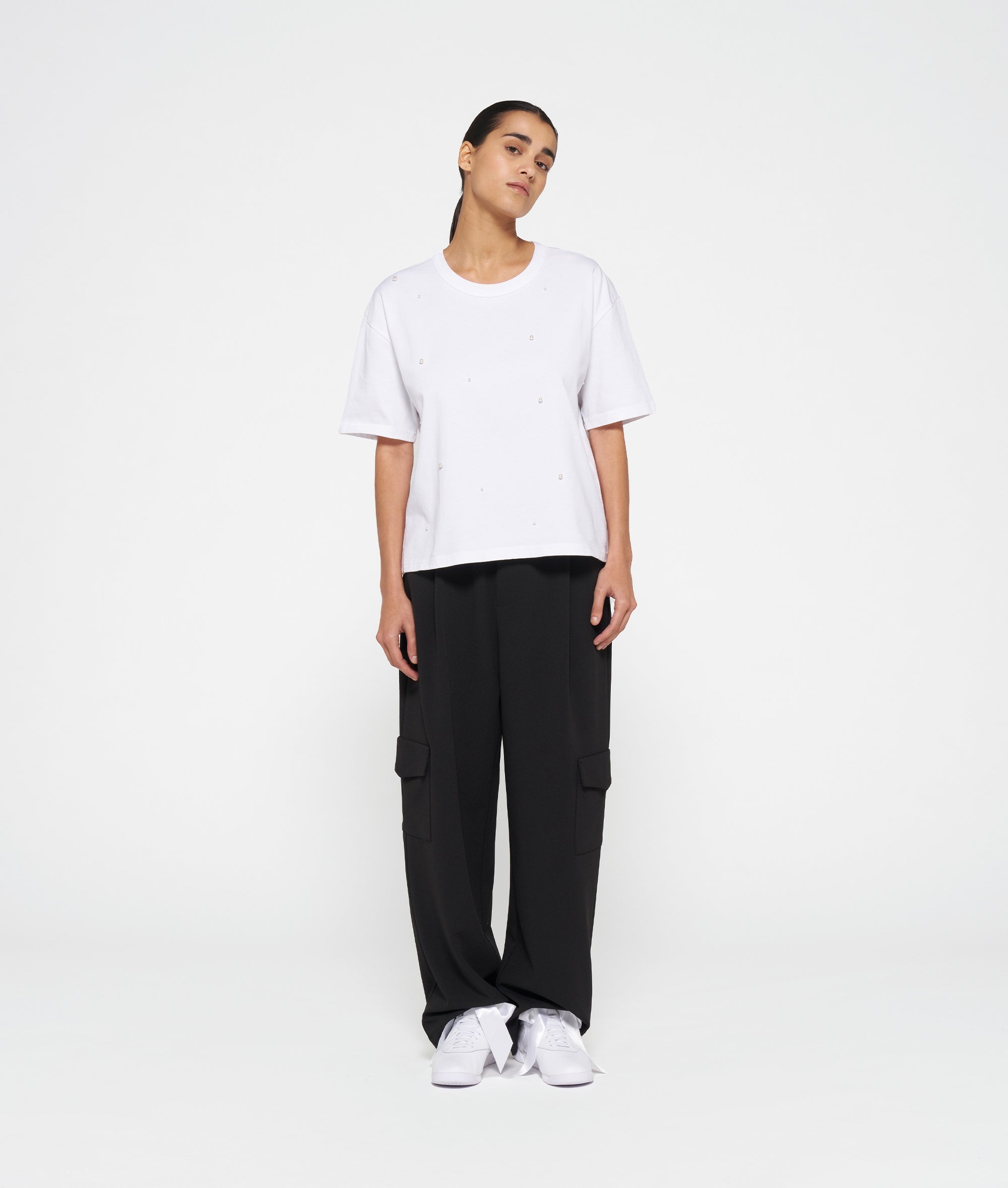 Relaxed Fit T-Shirt aus robustem Baumwolljersey mit auf der Vorderseite und den Ärmeln aufgestickten Perlen. Mit einem Rundhalsausschnitt aus Rippenstrick, einer „Mini Stripes“-Stickerei auf dem Rücken und einem kleinen „Medal“-Label in der linken Seitennaht.