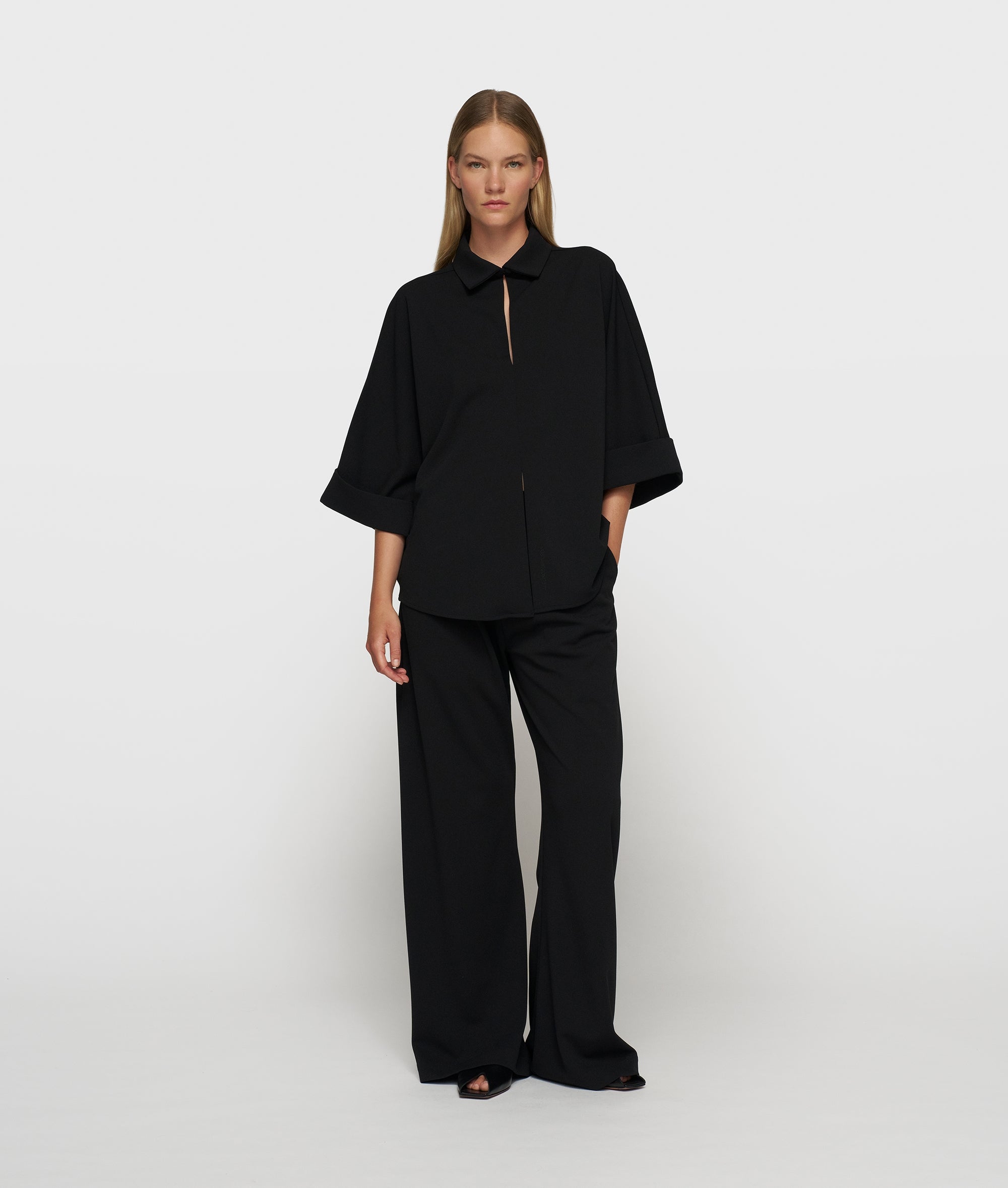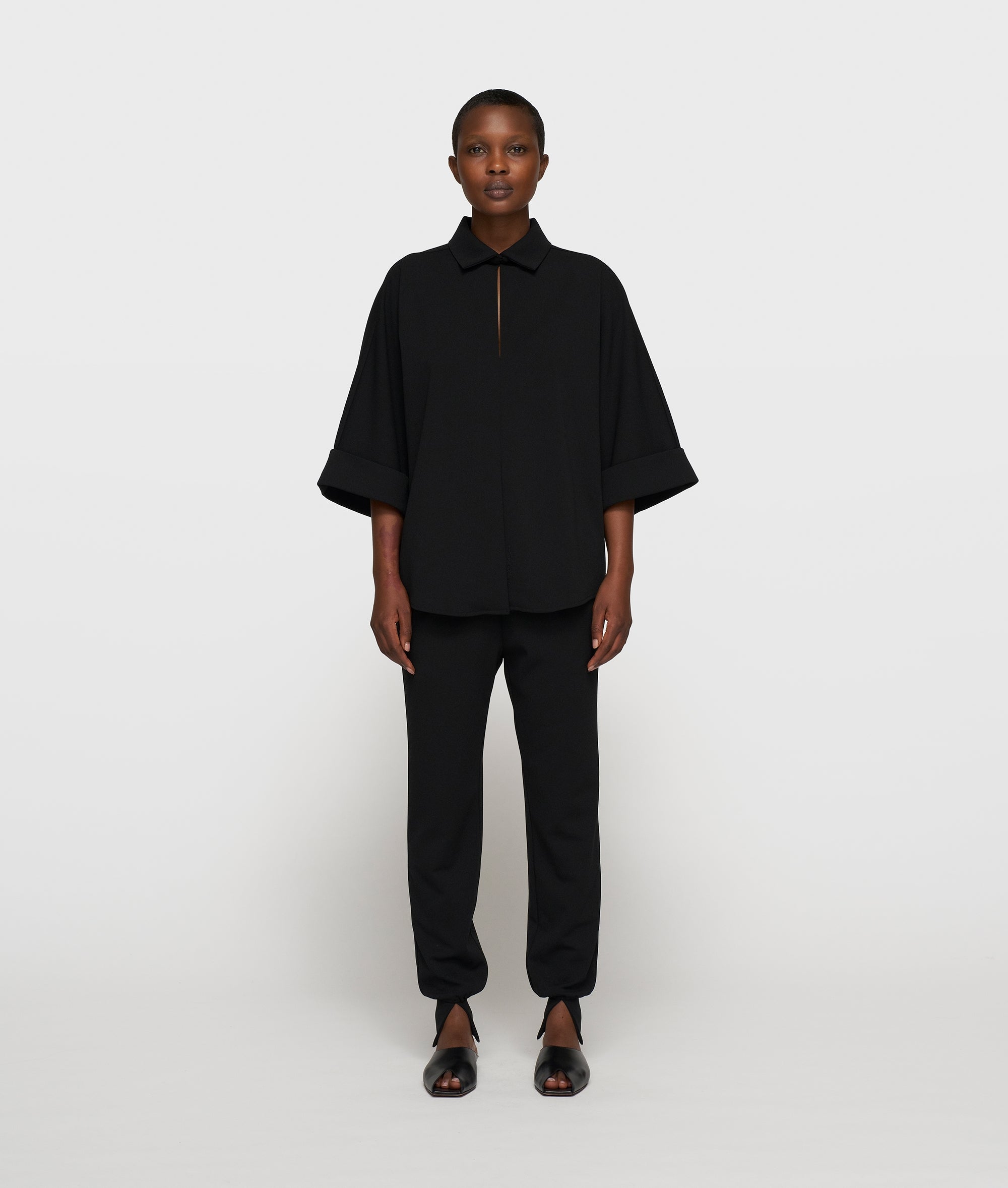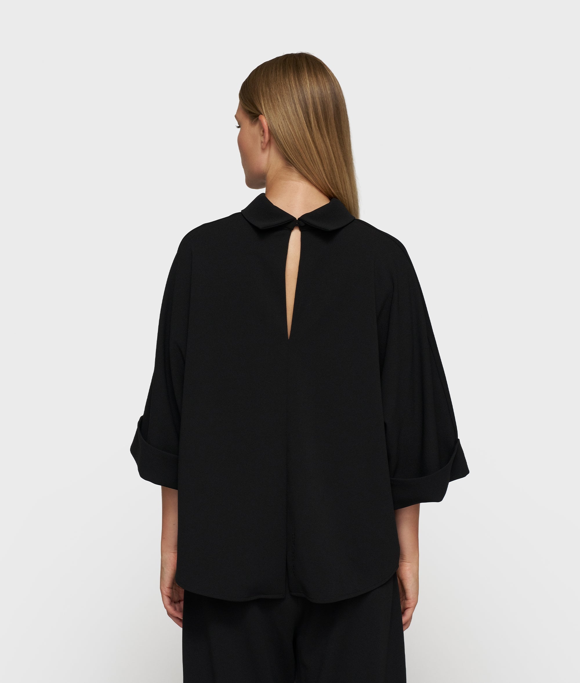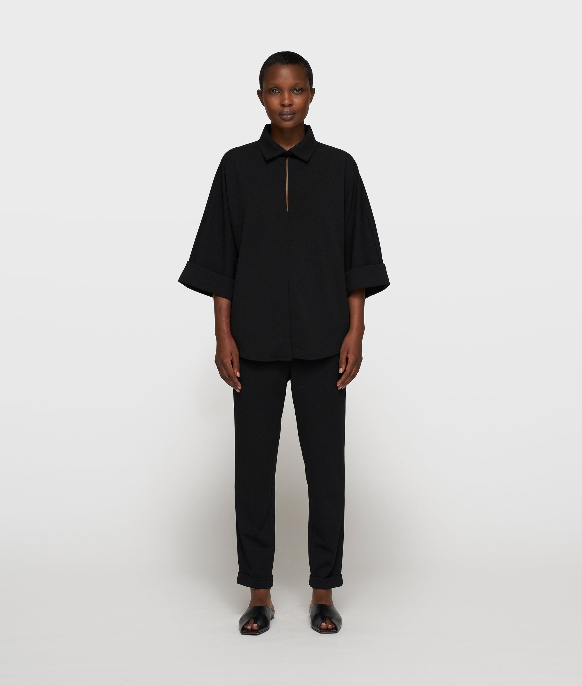 Dieses Oberteil im Relaxed Fit ist aus leichter schwarzer Crêpe-Stretch-Qualität gefertigt und trägt sich den ganzen Tag über angenehm. Das Design ist wendbar und kann auf zwei Arten getragen werden: mit einem klassischen Kragen oder als Stehkragen. Die mittellangen Ärmel mit umgeschlagenen Manschetten und tiefem V-Schlitz sorgen für einen modernen, gepflegten Look. Die Stickerei „costume comfort“ am Saum unterstreicht das markeneigene Design der Kollektion.