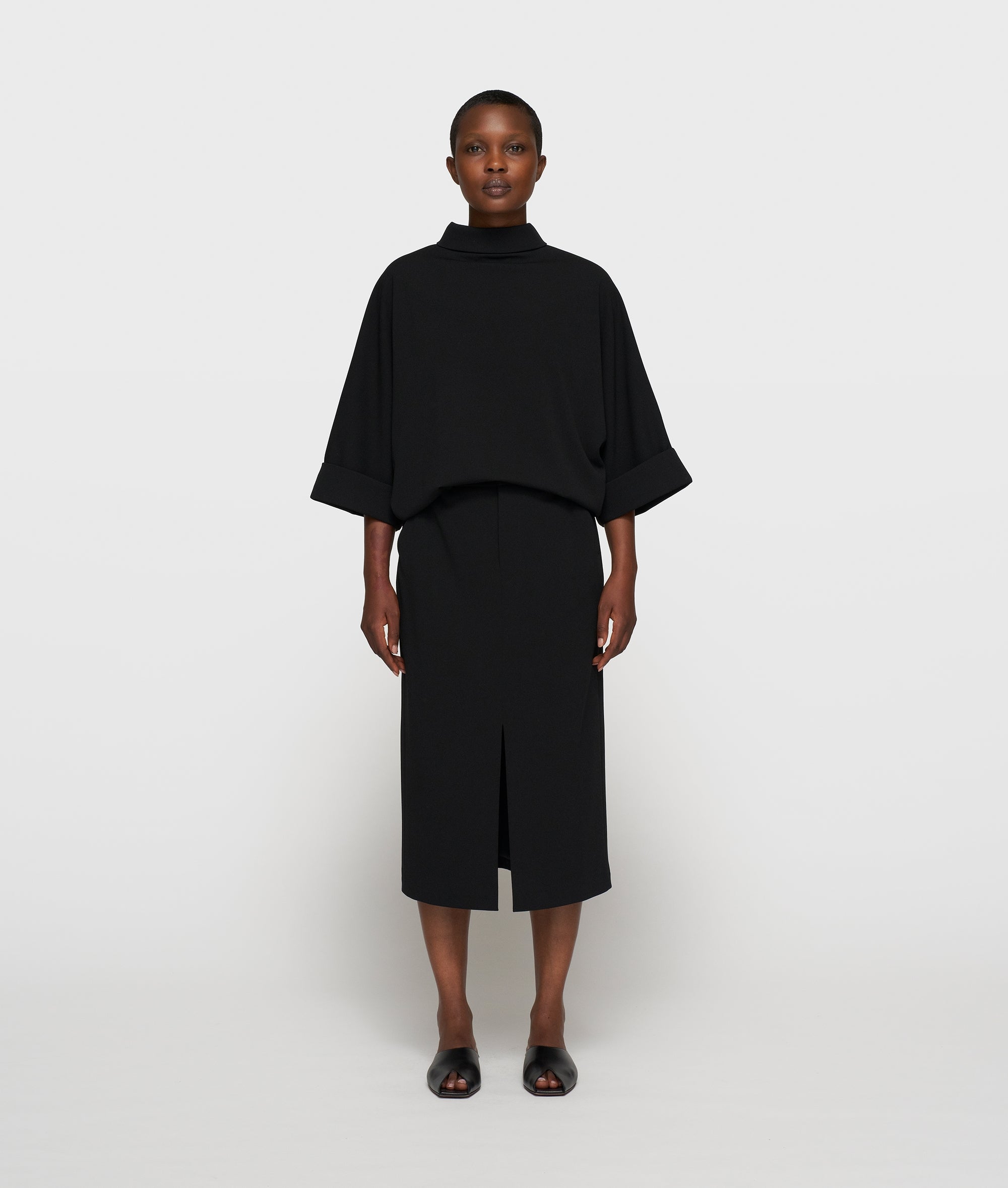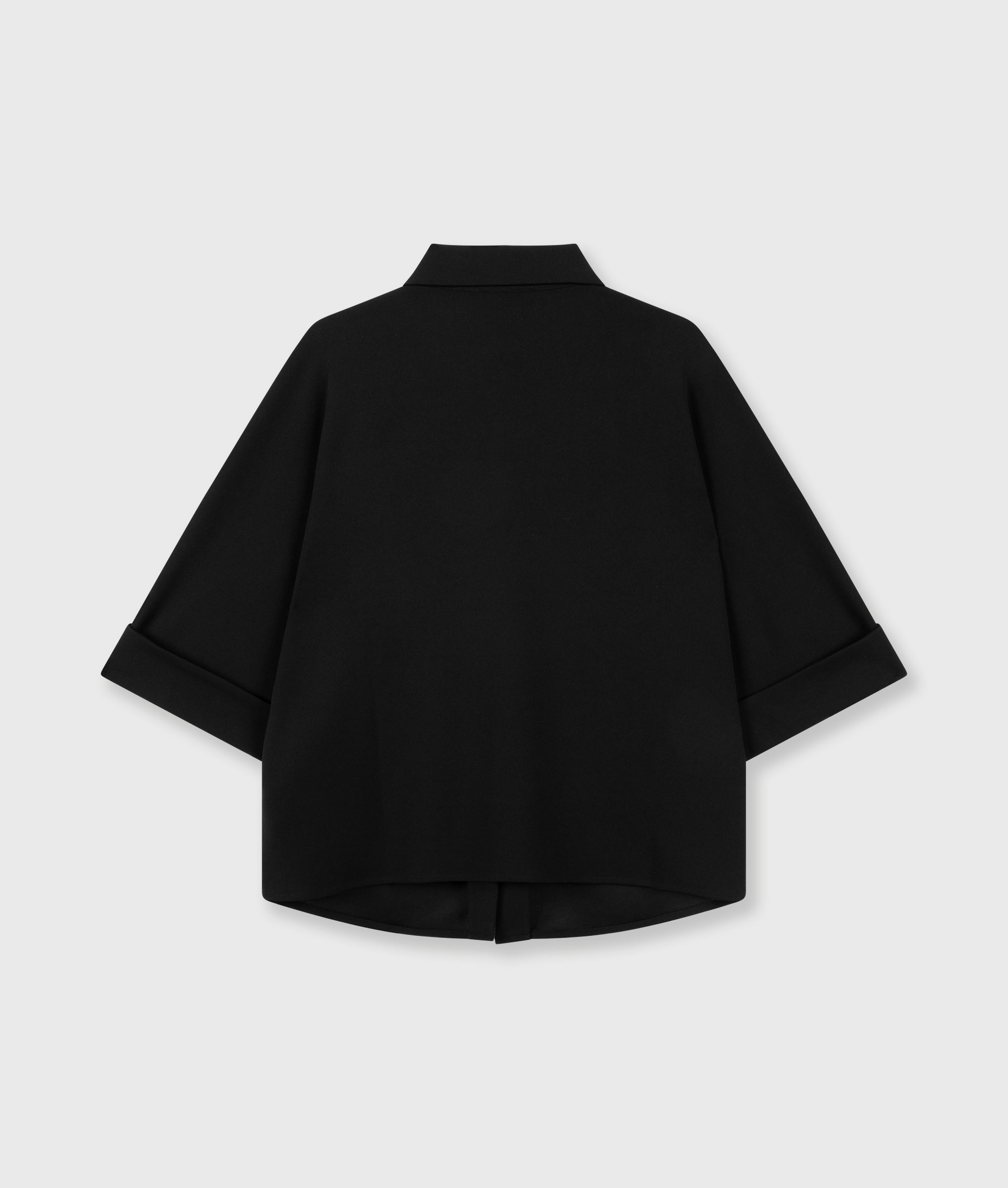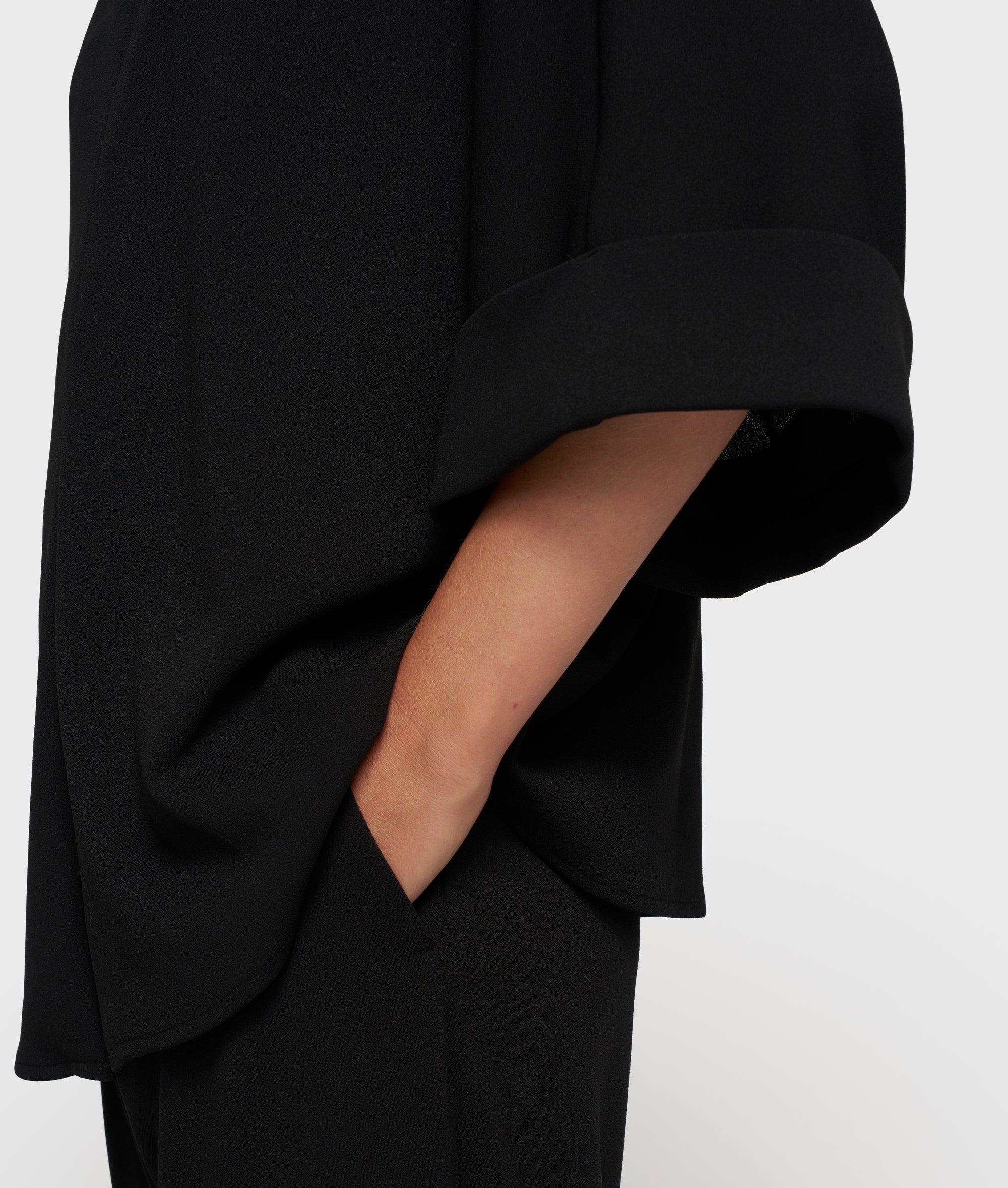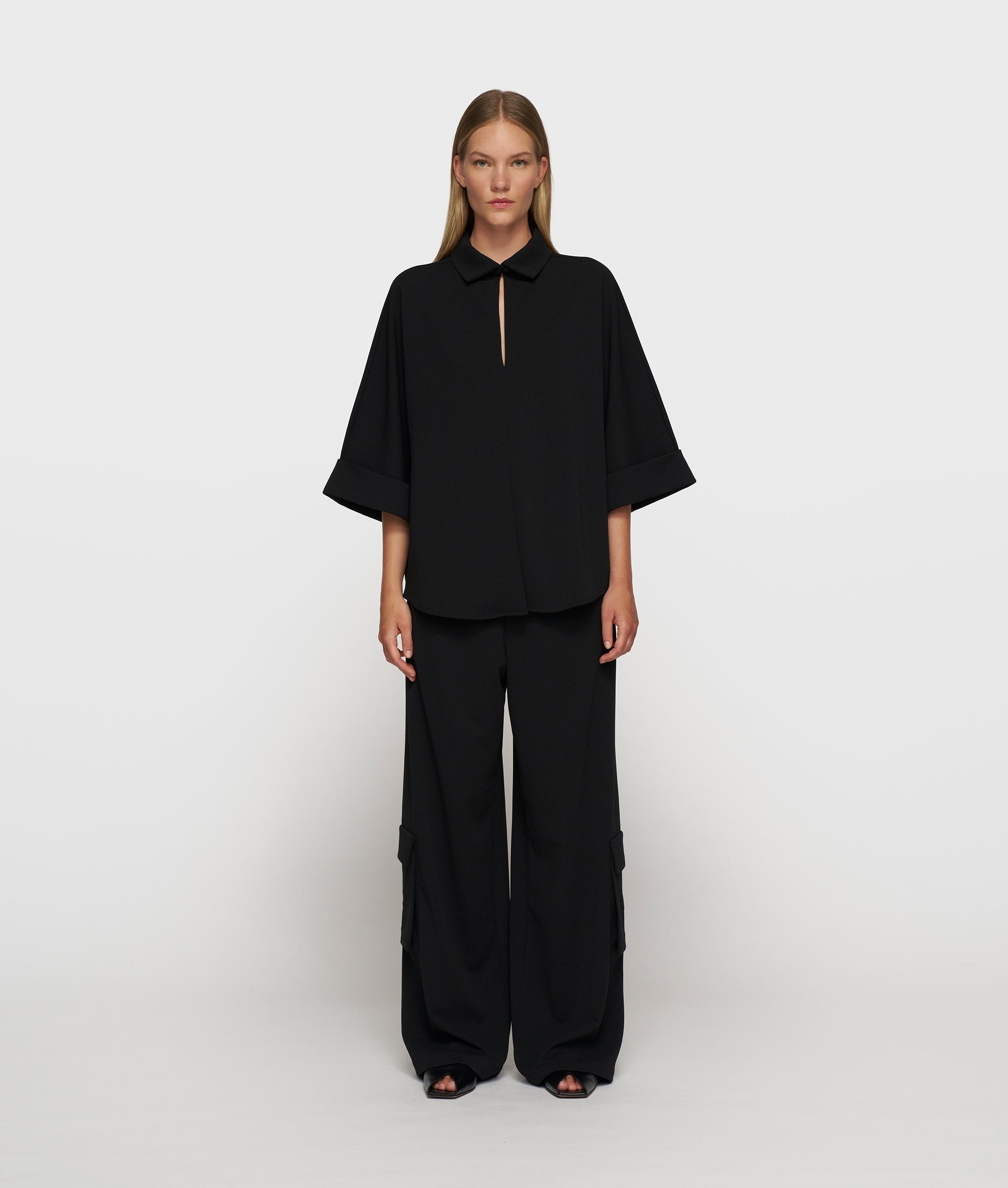 Dieses Oberteil im Relaxed Fit ist aus leichter schwarzer Crêpe-Stretch-Qualität gefertigt und trägt sich den ganzen Tag über angenehm. Das Design ist wendbar und kann auf zwei Arten getragen werden: mit einem klassischen Kragen oder als Stehkragen. Die mittellangen Ärmel mit umgeschlagenen Manschetten und tiefem V-Schlitz sorgen für einen modernen, gepflegten Look. Die Stickerei „costume comfort“ am Saum unterstreicht das markeneigene Design der Kollektion.